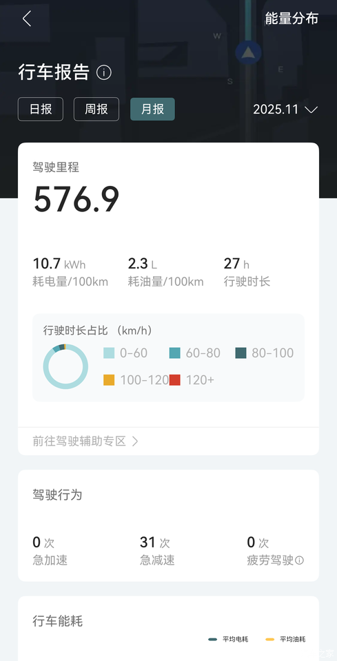 可能是我比较注重脚法,不激进,所以这段时间开下来,选择“舒适”模式加上标准动能回收,整体纯电部分的续航达成率还是非常满意的。城市里用纯电模式,高速用混动模式(平均车速控制在100左右)整体能耗控制的非常不错。