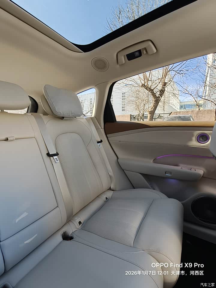 后排地板纯平,我爸妈坐中间腿能伸直,不像之前那辆车脚得岔开。后备箱能塞下婴儿车加两个行李箱,但垫子下面就是电机,没有下沉空间,婴儿车得斜着放。车门储物格浅,放瓶矿泉水容易晃倒,我后来买了个网兜固定。天窗太大夏天晒头皮,只好贴了反光膜。