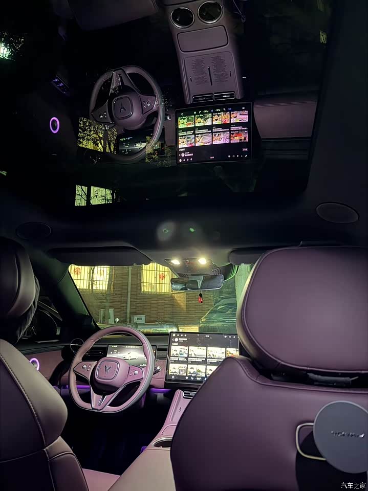 内饰我选极光紫,有点冒风险,坐进来颜色偏深紫低饱和,摸得到的地方软包到位,中控和门板上那条深色木纹搭起来不冷,氛围灯256色,晚上配内饰色调,亮度和分区能调,15.6英寸屏把科技堆起来
