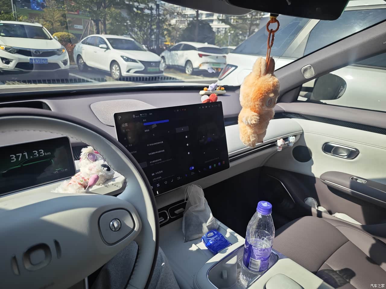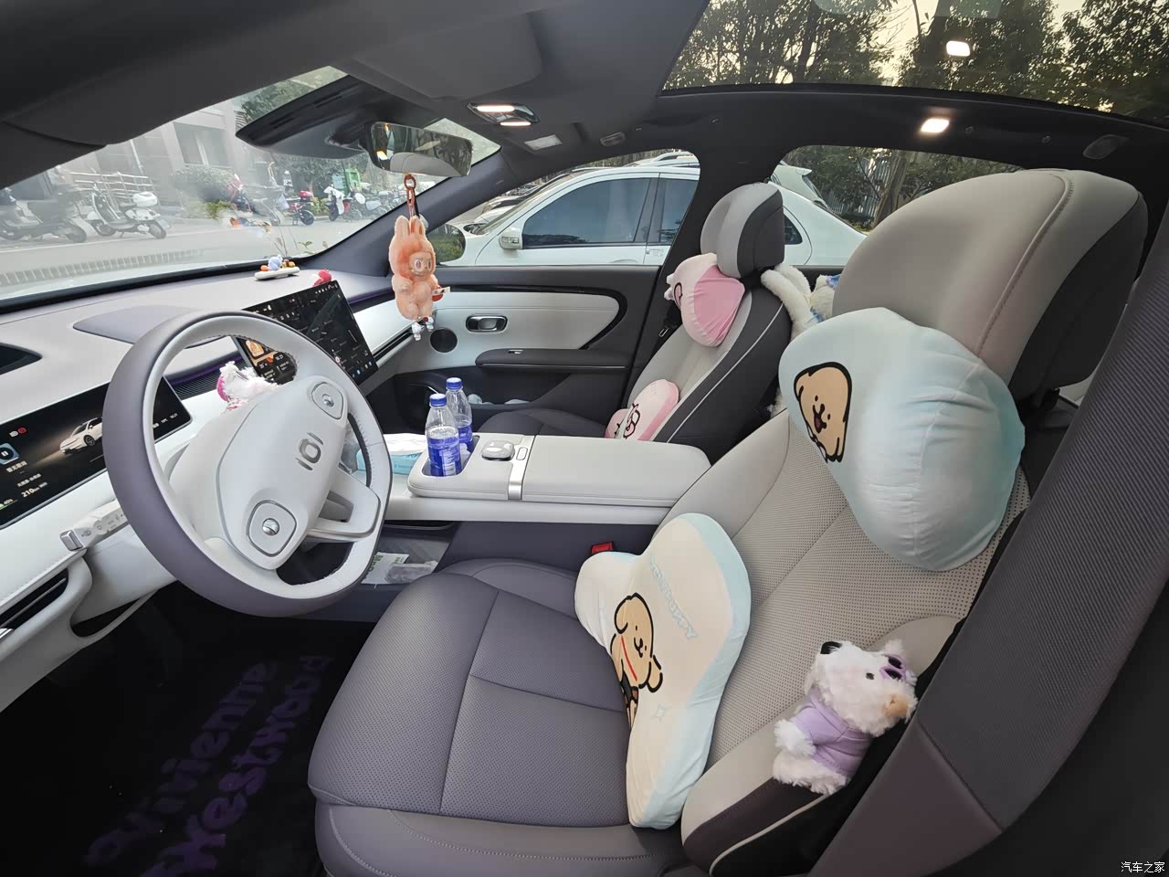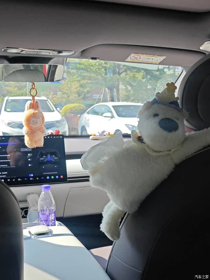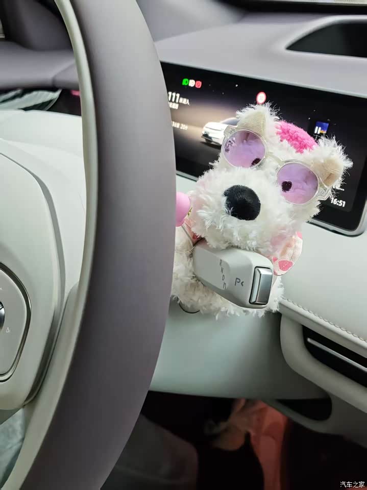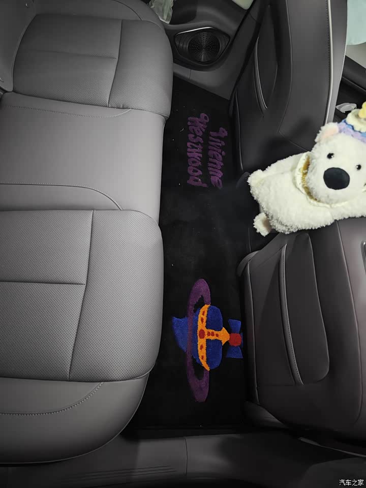 内饰:紫白拼色相当精致,稍加点缀都很好看,内饰有很多设计小巧思,大面积软包很舒适,车子买回来以后就和老婆买了好多东西做装饰,强烈推荐这个怀档小狗,特别漂亮。 由于内饰是紫色白色拼色,推荐选择深色图案的脚垫,比如深紫色或者黑色