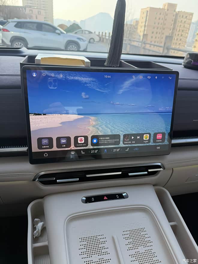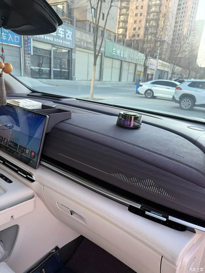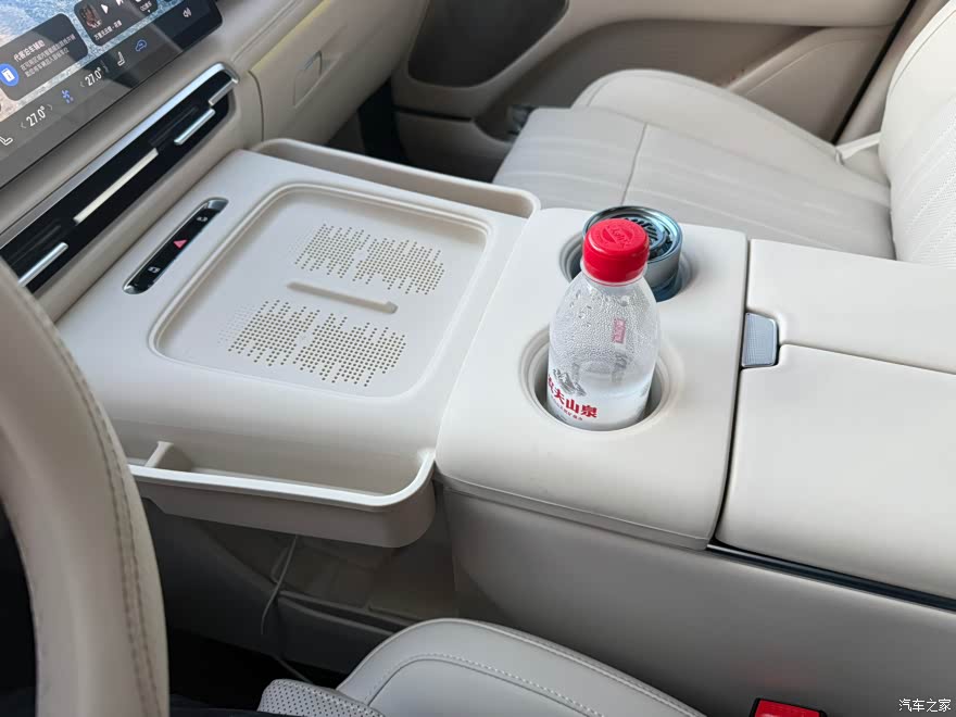 用下来也有两个小不顺,前排那块50W无线充电,名字看着挺猛,实际发热明显,充十来分钟摸手机有温度,夏天太阳直射中控区域更热,我就不愿意让手机一直在那位置待着,充电板在档杆下面的悬浮区,手机放进去,看通知想操作也不顺手,抬头低头的距离不舒服,我后来直接插线放上面储物格,省事。副驾这边娱乐少了点,前排两块屏,一个中控一个仪表,副驾坐着用中控看内容角度不太顺,长途就拿自己的手机,二排有顶挂的17.3英寸屏,后排人用得多,现在许多车都给副驾配独立屏,这台车定位是全家出行,前排这块显得克制。
