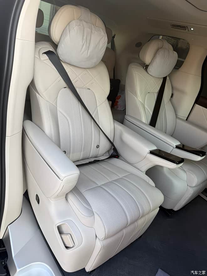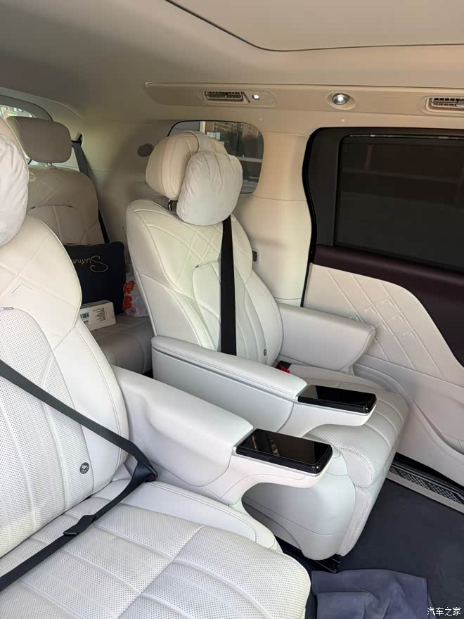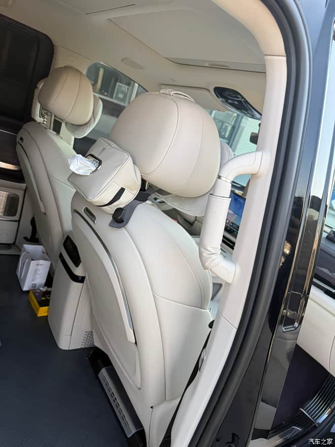 空间是亮点,我一米七八,驾驶位调好,头部腿部都松,二排两个独立座椅轨道够长,驾驶位后移也能翘腿,电动调节、腿托、加热、通风、按摩配齐,一键零重力躺下就是休息的姿态,三排是能坐成人的,坐垫长度厚度到位,靠背还电动可调,我进去腿部留有一拳多,头部不压,七个人一起出门,每个人都正坐,储物位置也多,门板、中控下方镂空、扶手箱大,随身物品能安放,满员时后备厢深度还在,两个28寸加一个登机箱竖着放下。
