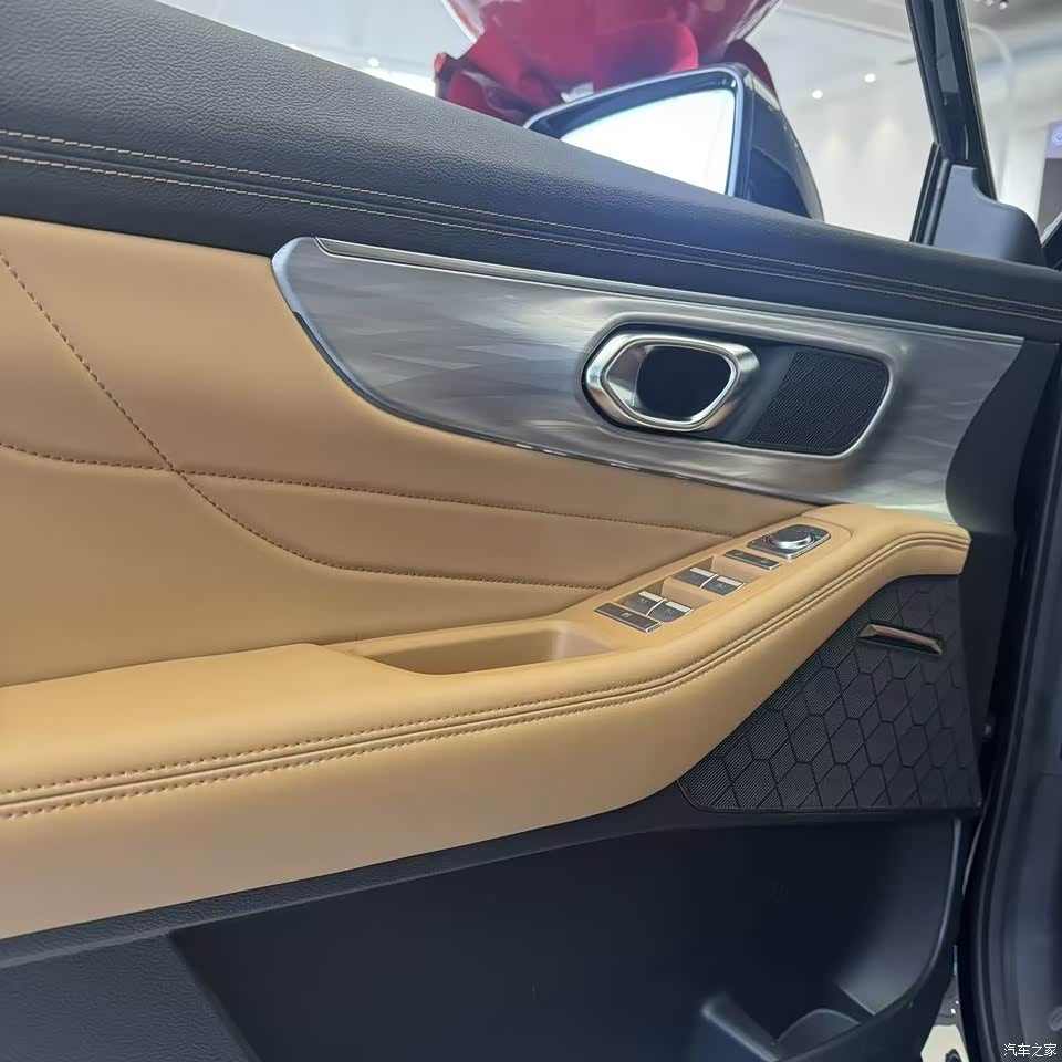 颜色搭配很温馨,不会像全黑内饰那样压抑,也符合我们年轻人喜欢的居家又时尚的风格。中控台上的仿木纹饰板质感不错,缝线也很整齐,细节做工看得出来很用心。