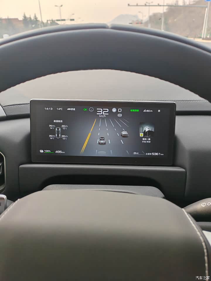买回来的时候已经是秋季,现在是冬季。所以没法说夏天的情况会怎么样。秋季最好的时候,充满电动态续航516,比501还多了一点。冬季就不大行了,市区6折高速5折的样子吧。