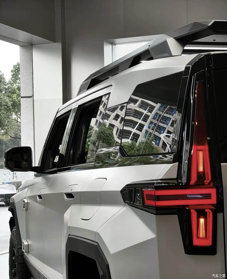 展车是白色的,这个颜色很耐看,也比较耐脏,对于经常要跑越野的车来说很实用。车身整体造型很硬朗,方方正正的轮廓很符合硬派越野的定位。前脸的设计比较简洁,大灯和格栅的搭配很协调,没有浮夸的设计元素。侧面的腰线笔直,轮毂的造型也很有力量感,搭配较高的离地间隙,越野气息很浓厚。车尾的设计中规中矩,尾灯的辨识度不错,整体看起来很稳重,符合我的审美。