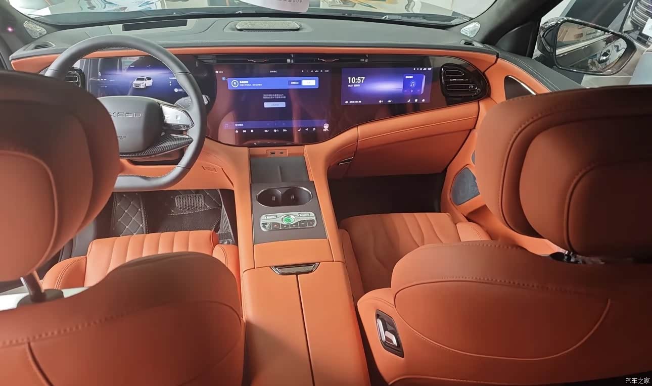 内饰的用料和做工都很用心,中控台采用软质搪塑工艺+木纹装饰板,触感和视觉效果都很高级;翻毛皮座椅透气性和防滑性俱佳,长时间乘坐也不会感到闷热;平底方向盘握感舒适,物理按键布局合理,盲操作也很方便;车内的氛围灯可调节多种颜色,提升了内饰的氛围感,整体内饰风格兼顾了豪华感与实用性。