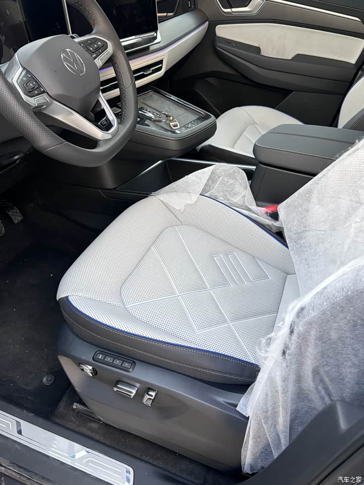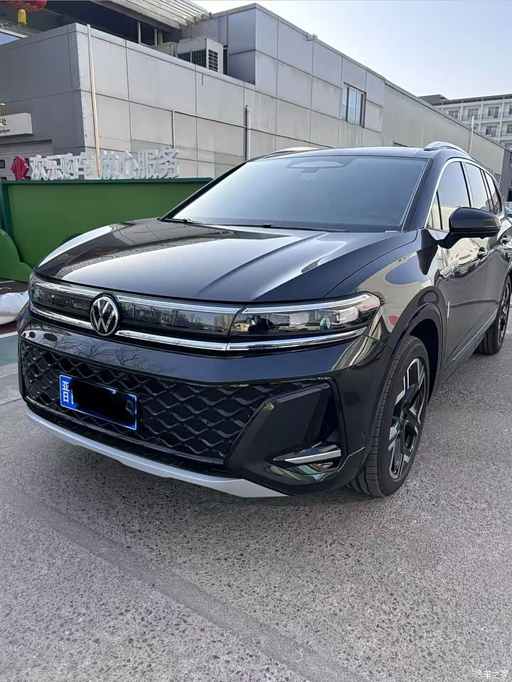 五米一几的车长,两米宽,站在那跟一堵墙一样,确实有“旗舰”的派头。我试的这个是旗舰版,前脸是黑网格的,看着比普通版那个带亮条的更精神、更年轻些。销售娃说这设计还能帮着导流、跑高速更稳当,咱不懂,反正看着不赖。车灯是贯穿式的,中间的大众标还能亮,晚上认车肯定方便。整体来说,这车样子不算多张扬、多霸气,就是个头大、线条敦实,是咱老百姓喜欢的那种稳重感。给个4星,实至名归。