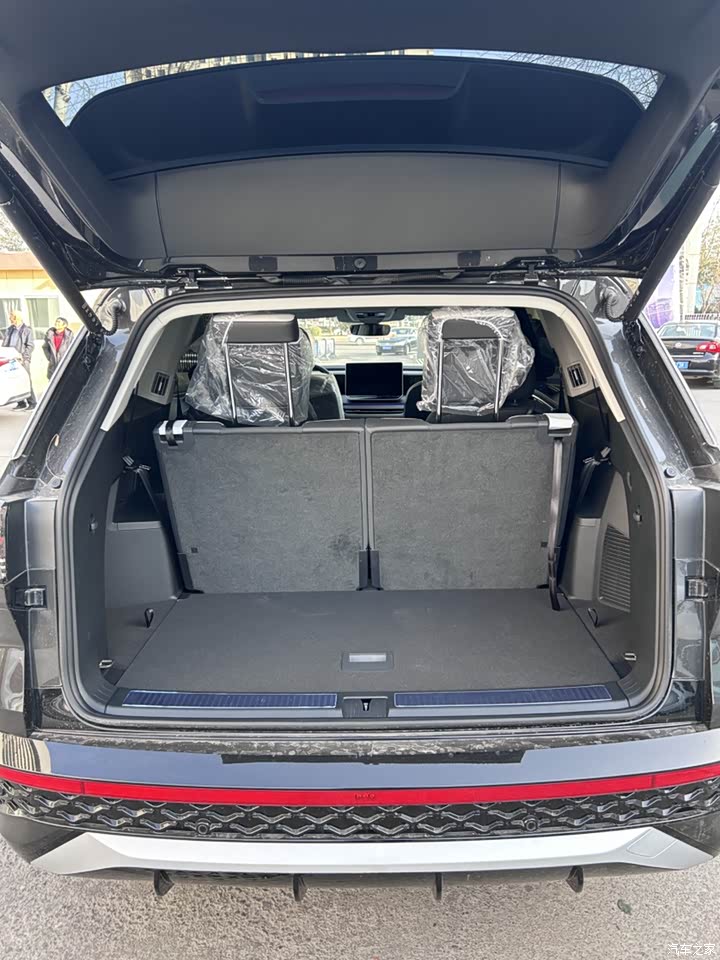 我试的是6座版,第二排是两个独立的大沙发座。坐上去,座椅通风、加热、按摩啥都有,扶手还能调高低,这待遇美气太太。关键是中间留了个挺宽的过道,我这一米七五的个头,不用挪前座,侧个身就走到第三排了,方便很。 说到第三排,这可是很多大6/7座SUV的“软肋”。但这揽境,我坐进去真不是“蹲小板凳”。腿能伸开,头离车顶也还有余地,靠背还能调角度。销售娃说这叫啥“高得房率”,意思是车里实用空间大。我看也是,就算三排都坐满大人,后备箱还能并排放下两个大号行李箱,这设计确实是用心了。