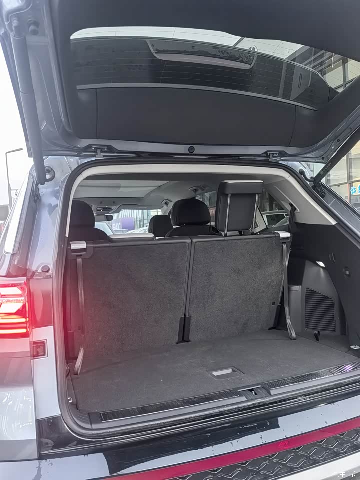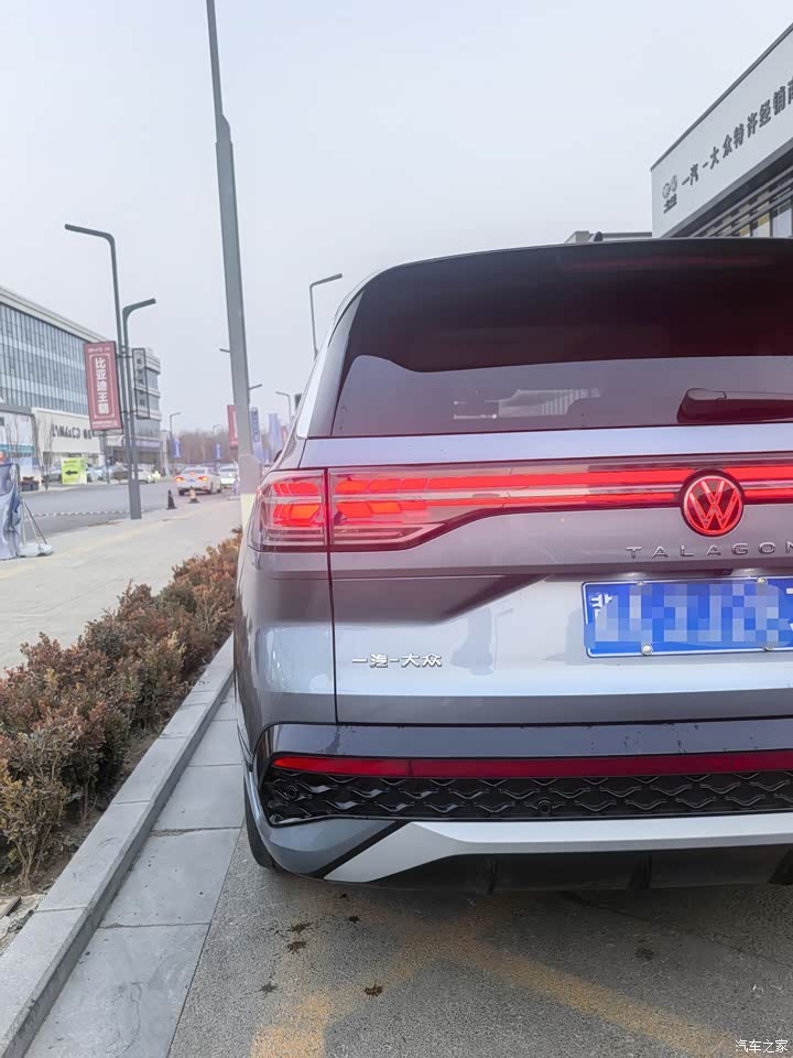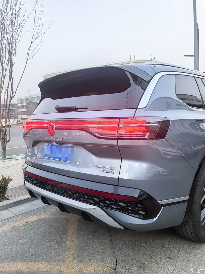 外观真的长在我的审美上,我选的R-Line运动款,前脸那个X型的熏黑格栅看着就带劲,镀铬饰条一搭,运动感直接拉满。车身侧面特别修长,21英寸的花瓣轮毂颜值在线,解锁的时候,天使之翼迎宾光毯一亮,瞬间觉得仪式感拉满,每次开车都特有面儿。贯穿式尾灯晚上点亮辨识度超高,后包围的双边四出造型看着就很霸气,朋友见了都问我这台车得不少钱。