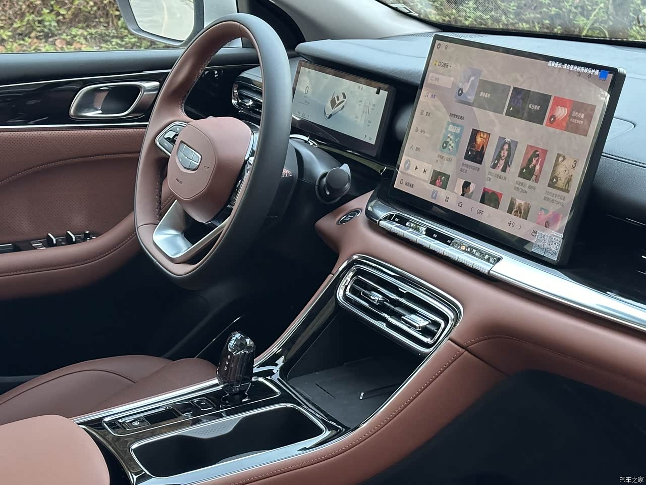 这款车的内饰就采用了吉利的家族化设计,中控区域就是对称式的布局,中控车机下方还设计了常用的实体按键,而且两色拼接的部分还有银色的镀铬装饰,不仅更有利于突出中控区域的层次感,同时也让整个内饰显得更加精致一些。