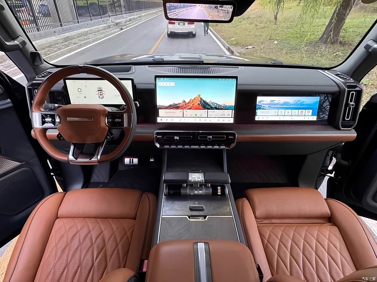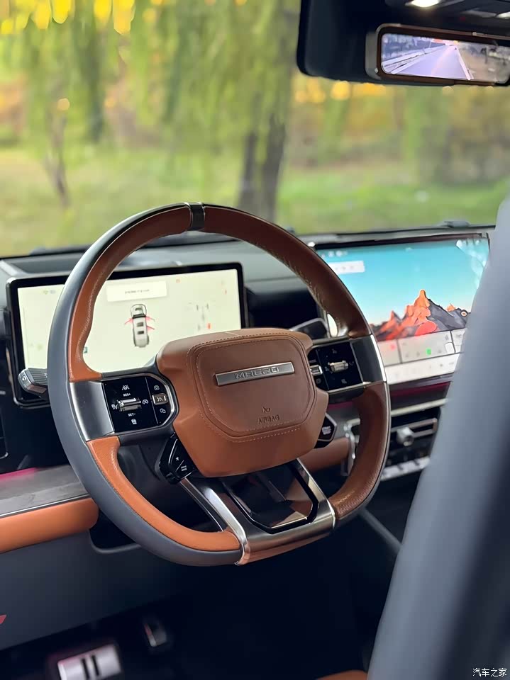 ,猛士917走的是粗犷中带精致的路线,与保时捷Boxster的运动奢华风截然不同。真皮方向盘握感饱满,电动调节功能能轻松找到合适的驾驶姿势,方向盘记忆功能对我这种固定驾驶者来说很省心。12.3英寸全液晶仪表盘显示清晰,HUD抬头数字显示能将车速、导航等信息投射到前挡风,不用低头就能获取关键数据,提升了驾驶安全性。