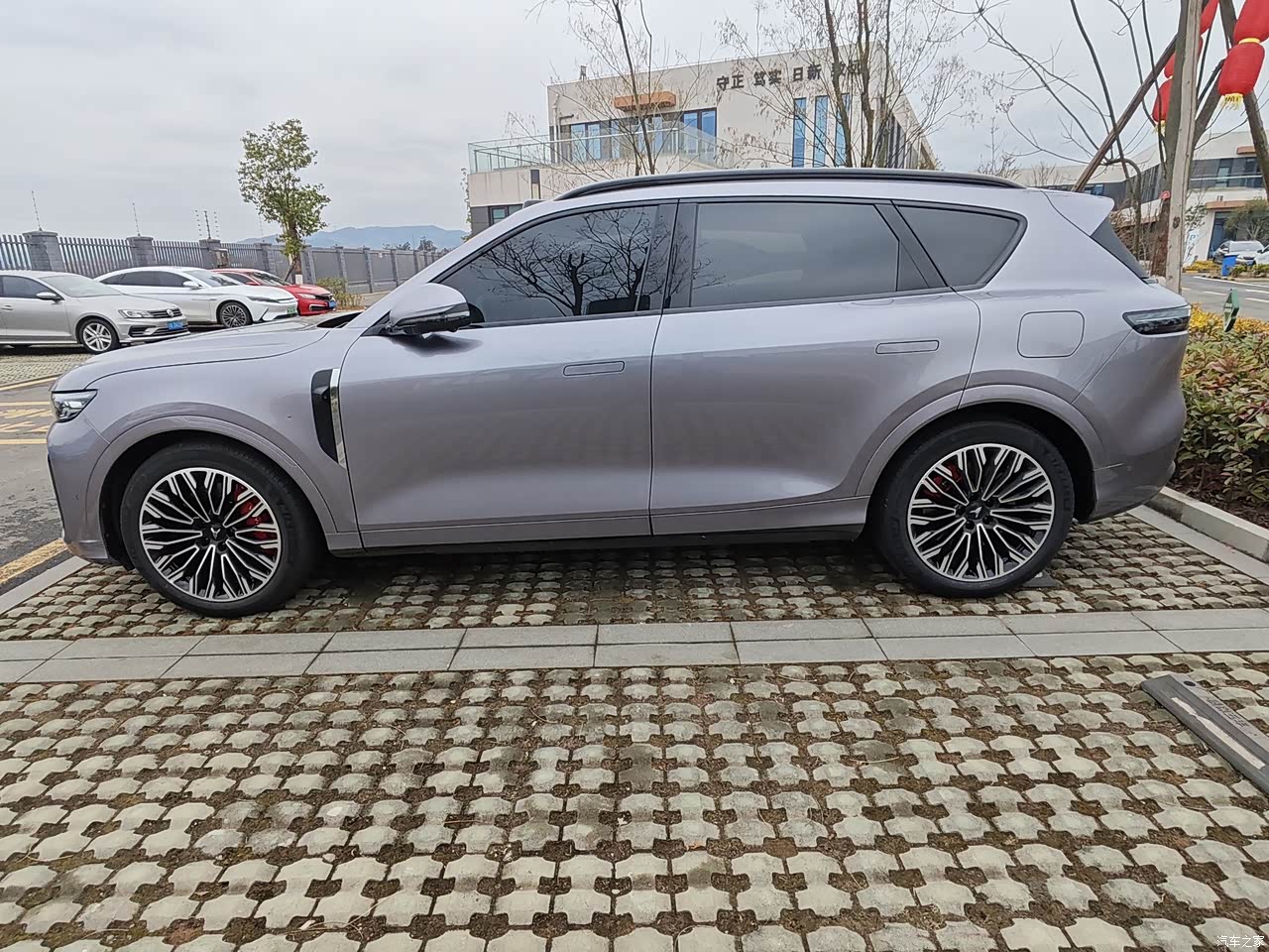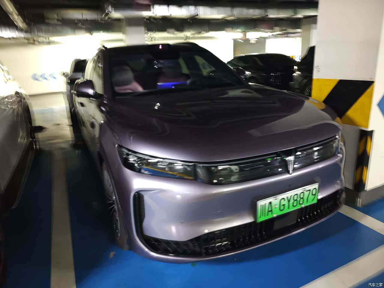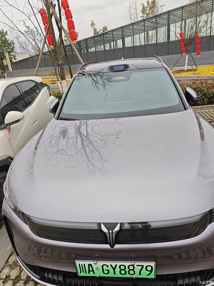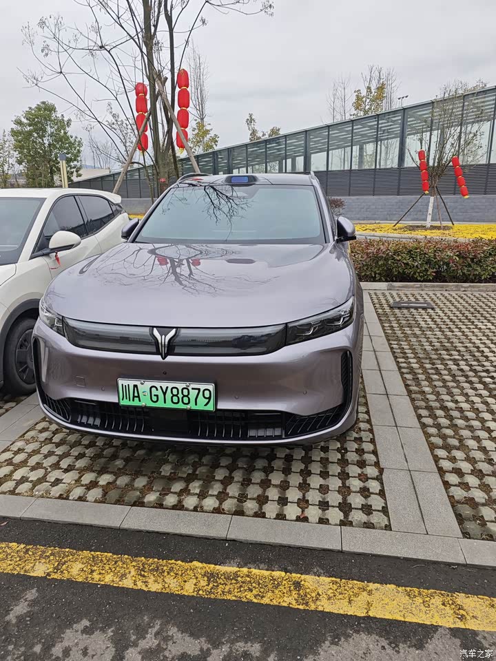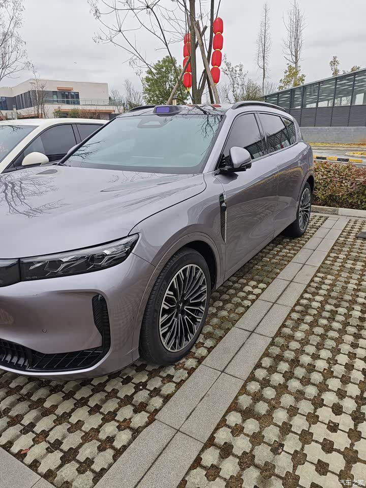 外观我选的是琉璃紫,实车颜色比图片更柔和,不是很艳的那种紫,里面透着一点金属灰的质感,太阳强的时候泛起淡淡的紫金,阴天收回去就是深一点的紫灰,车长接近五米,这种体量配上这套色彩,远远看过去不冲,近了看细节挺有意思,前脸星钻格栅能点亮,贯穿灯带连起来,晚上一解锁灯组像水流一样依次亮,侧面的线条顺着门和翼子板延伸,隐藏式门把手收进去,侧面干净,整车看久了不腻。