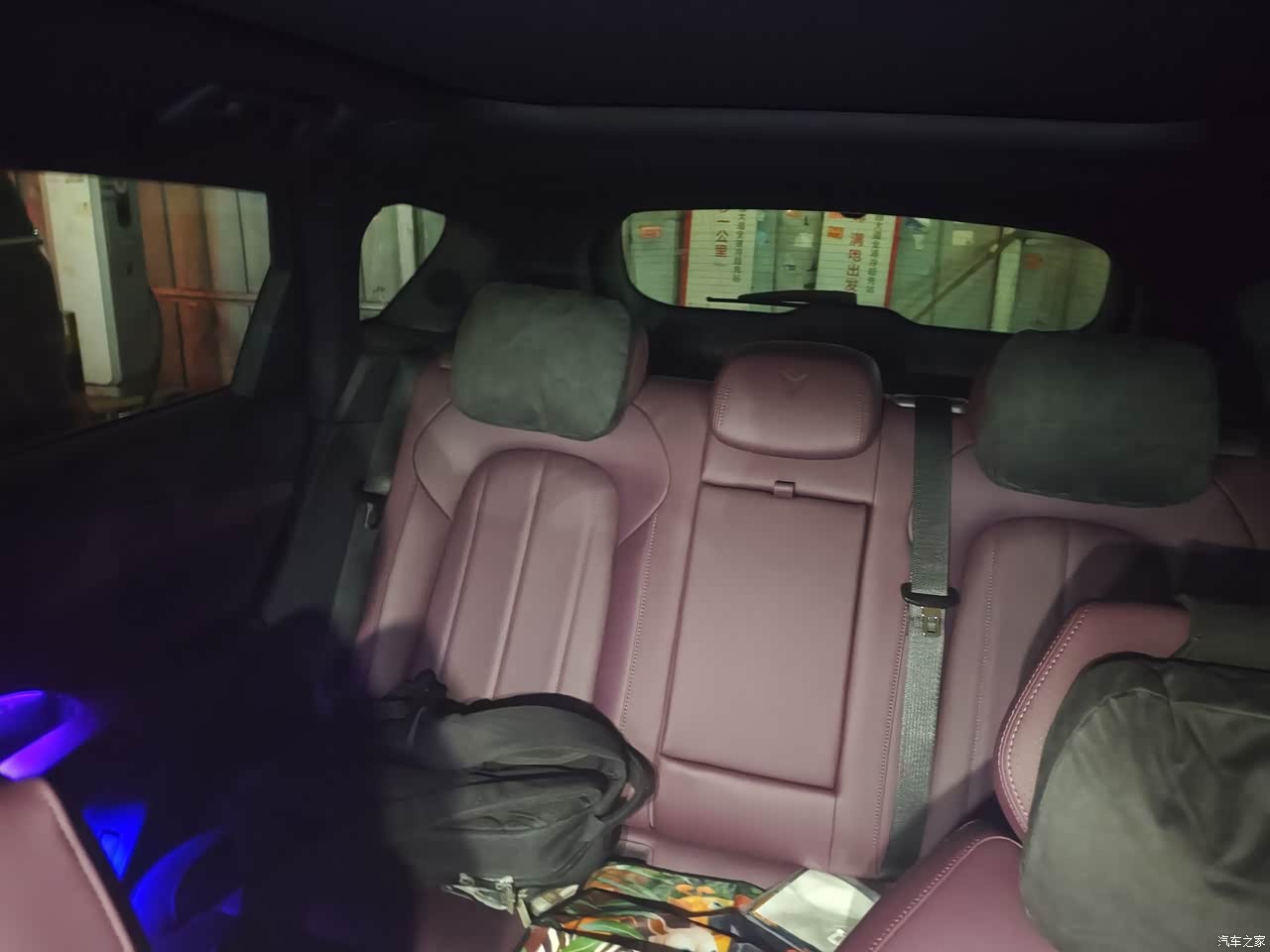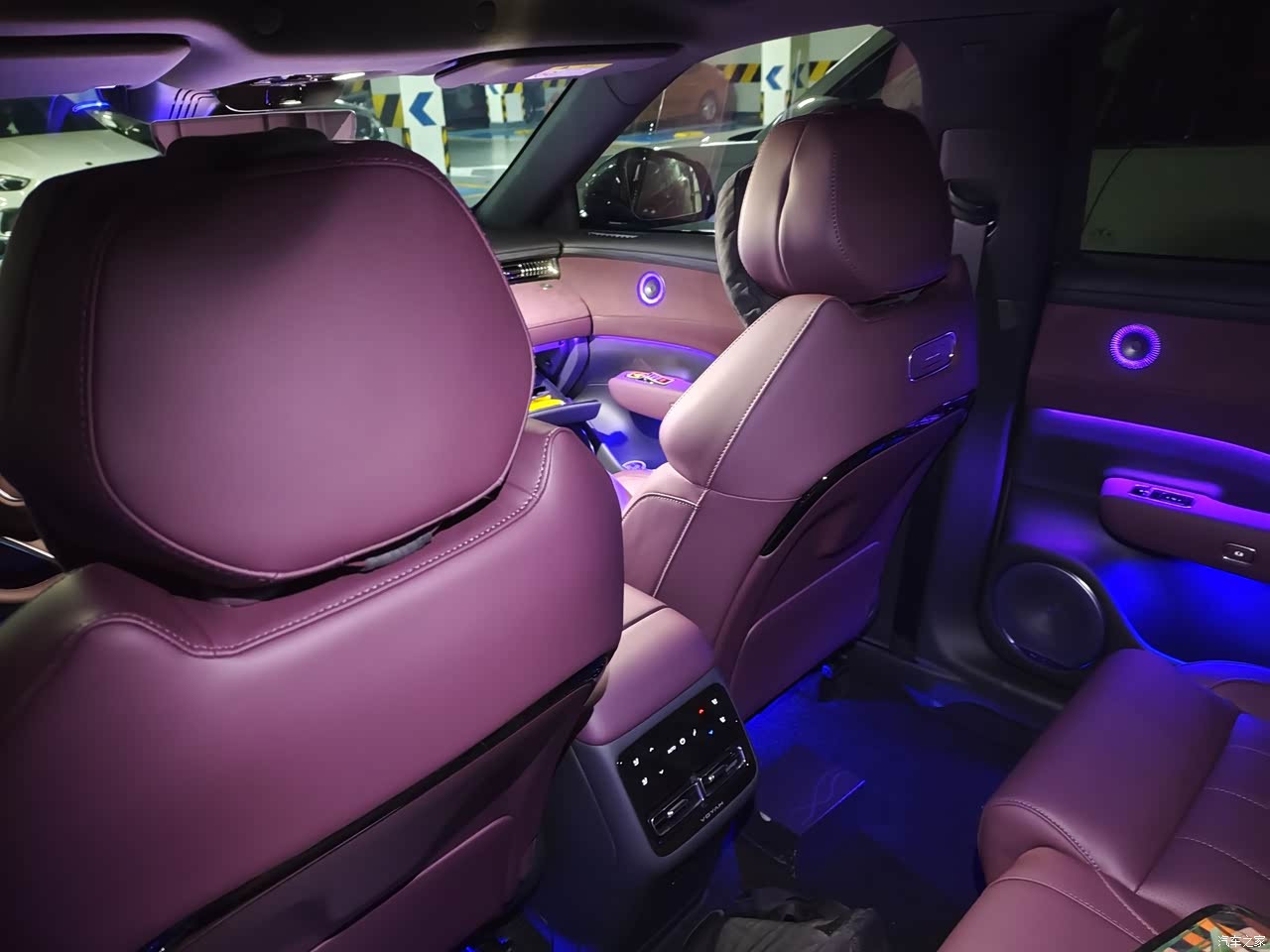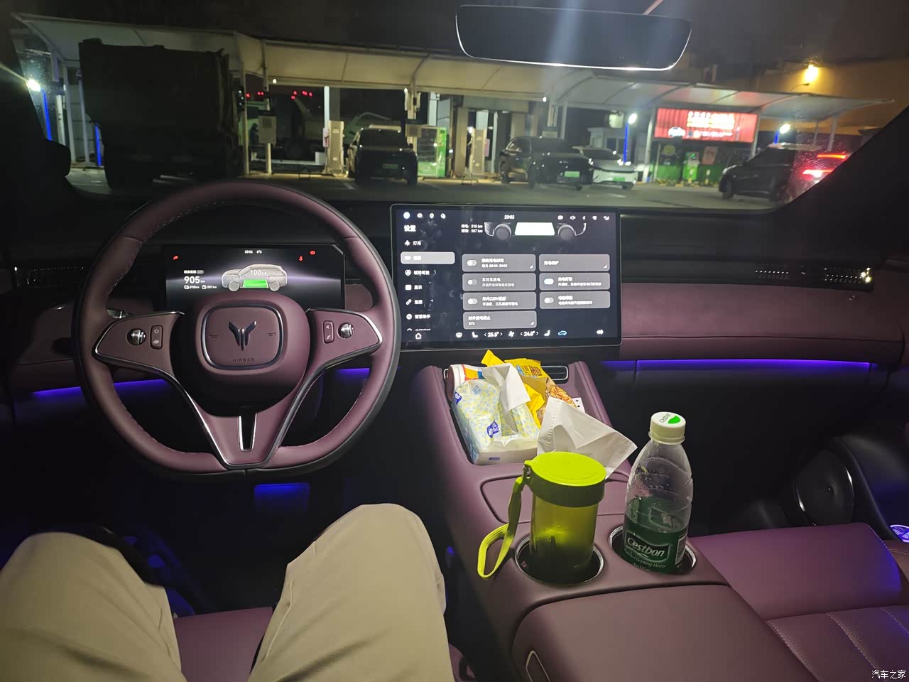 内饰极光紫,偏深带一点蓝调,黑色顶棚和金属细节拼起来有一种包裹的安静,手摸得到的地方大多是软质,中控台和门板仿麂皮和木纹一起用,上车那几天味道不重,中间那块十五点六英寸的屏幕亮度足,画面细,手指滑动没有拖泥,前排座椅配置给满了,通风加热按摩都在,主驾记忆,副驾电动腿托,座椅放趟后背角度能靠近躺平,停服务区闭眼休息不费劲。