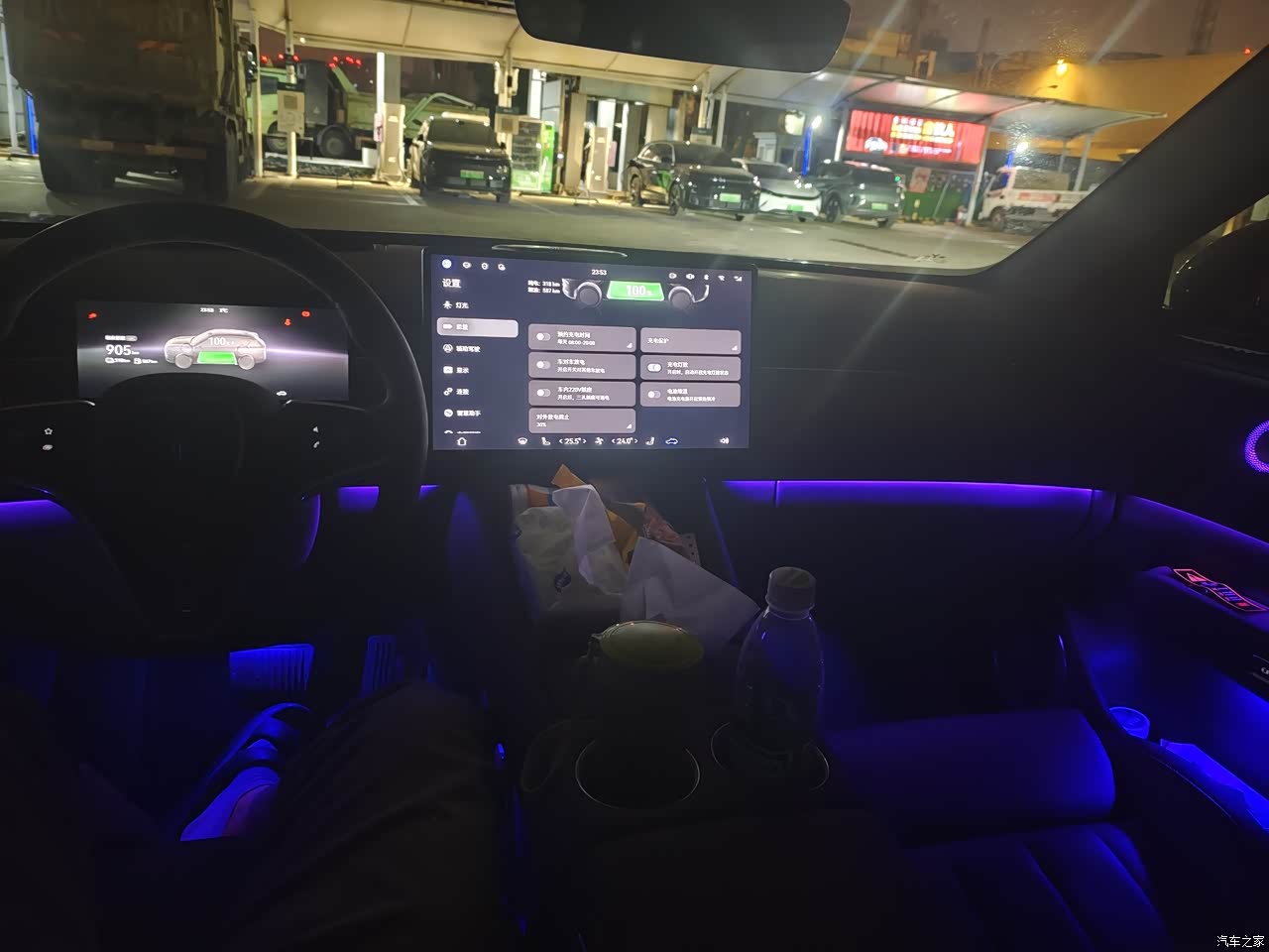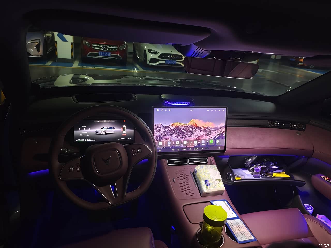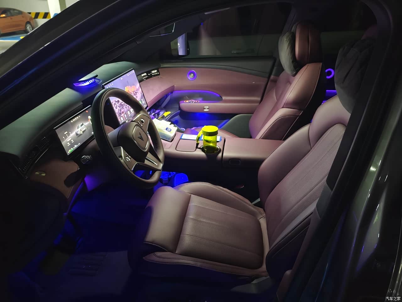 内饰极光紫,偏深带一点蓝调,黑色顶棚和金属细节拼起来有一种包裹的安静,手摸得到的地方大多是软质,中控台和门板仿麂皮和木纹一起用,上车那几天味道不重,中间那块十五点六英寸的屏幕亮度足,画面细,手指滑动没有拖泥,前排座椅配置给满了,通风加热按摩都在,主驾记忆,副驾电动腿托,座椅放趟后背角度能靠近躺平,停服务区闭眼休息不费劲。