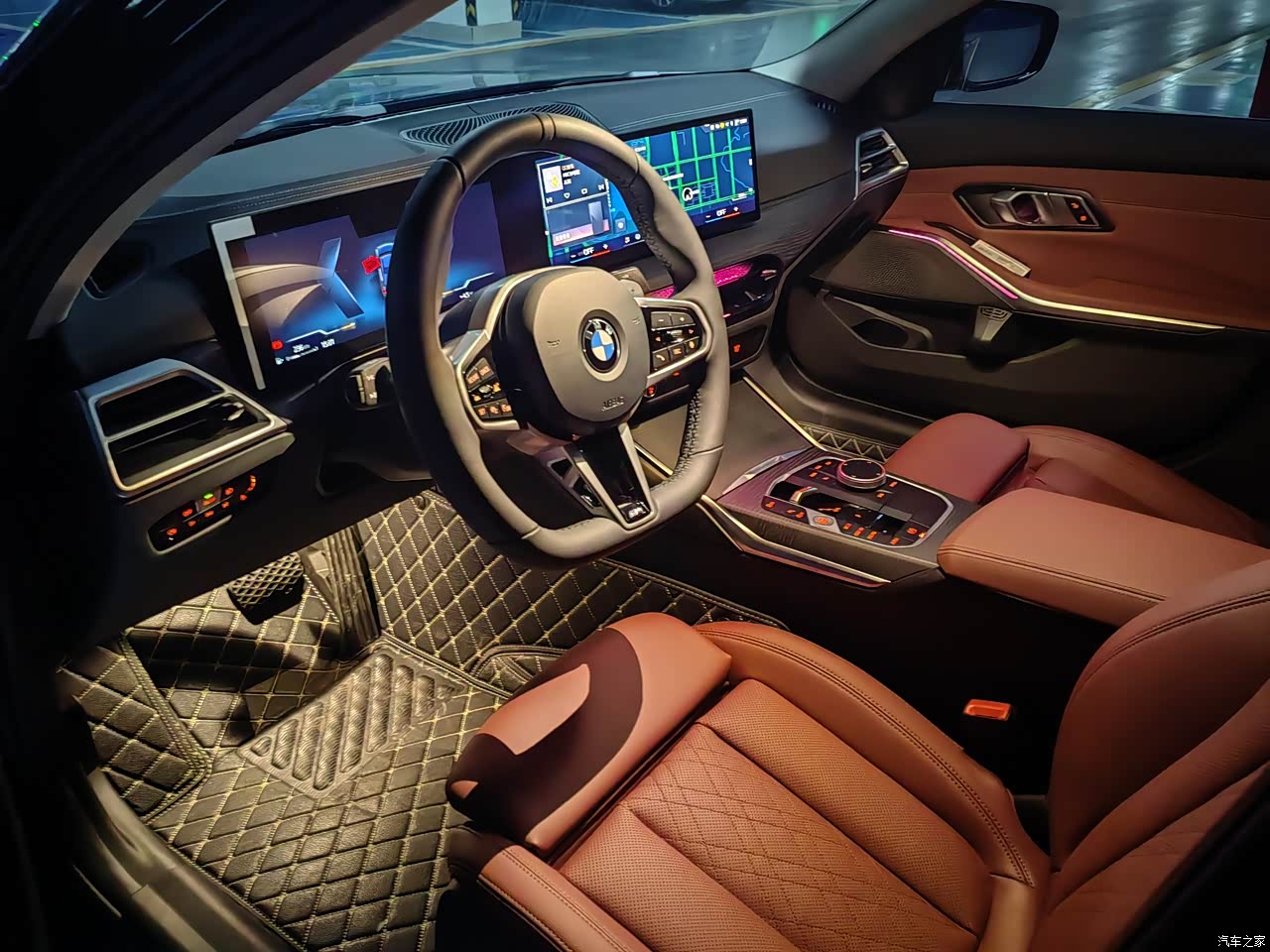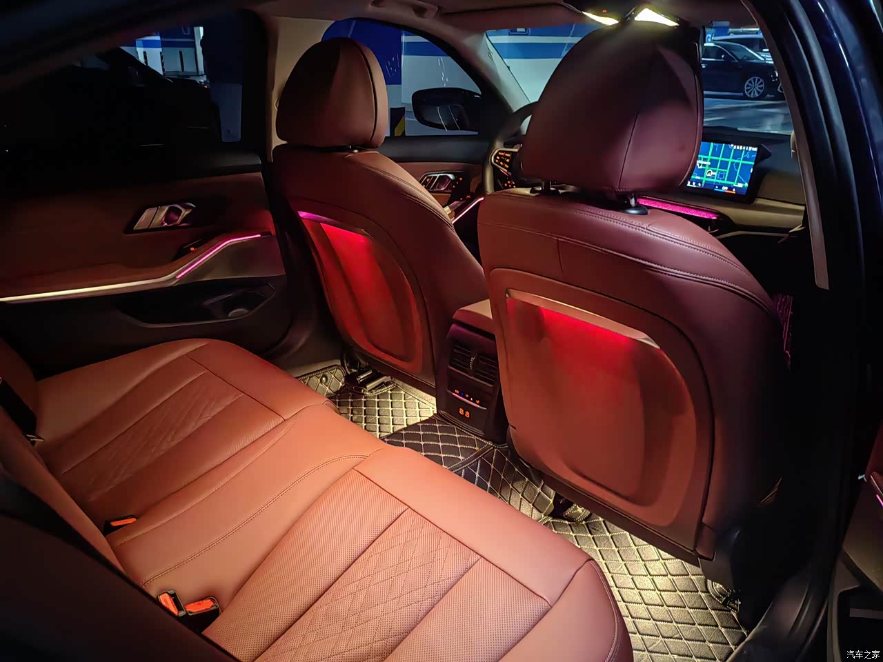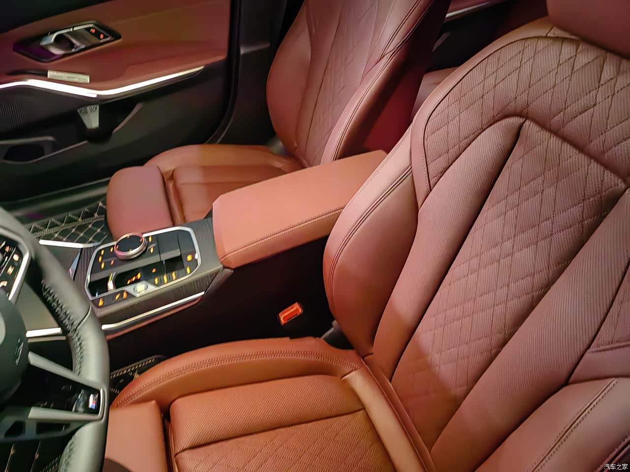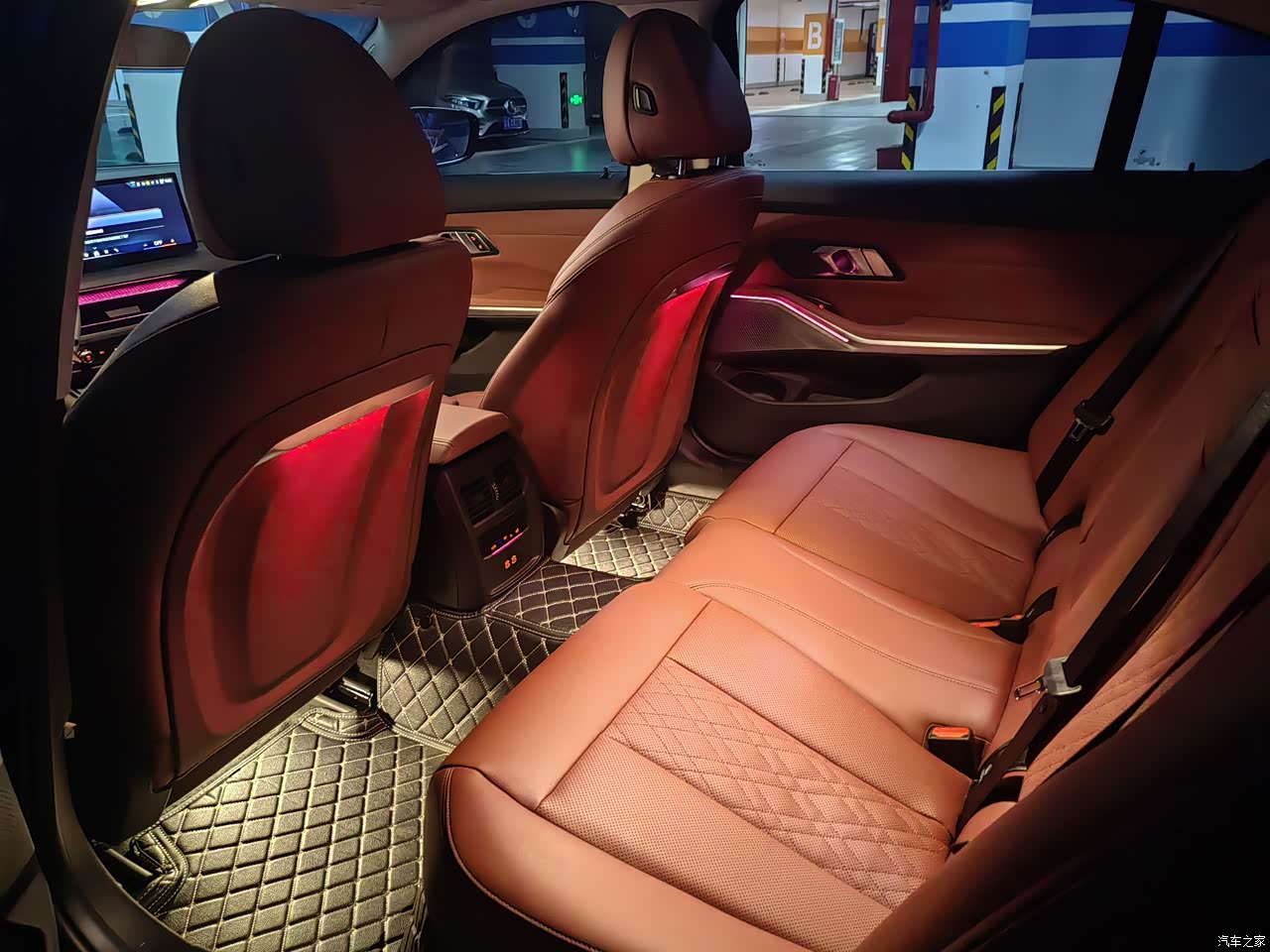 内饰方面,宝马的风格比较简约实用,没有奔驰那么奢华,但质感还是在线的。大面积的软皮包裹,摸起来很舒服,搭配红色缝线,运动感十足。12.3英寸的全液晶仪表+14.9英寸的中控连屏,科技感拉满,屏幕显示清晰,操作也流畅。不过内饰的塑料件有点多,尤其是门板下方,摸起来有点廉价感,而且氛围灯的数量不多,晚上开车的时候氛围感差点意思,后期打算自己加装一下。