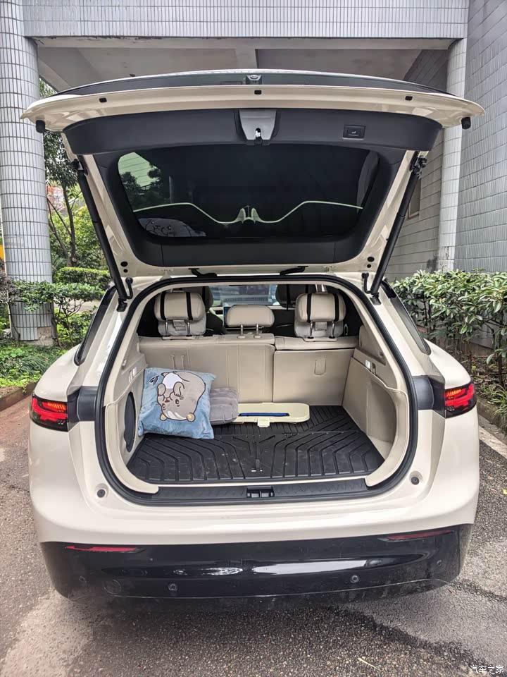 说到不顺手的地方,前备箱没有,这台纯电的机舱盖掀开,各种部件塞满,能放东西的地方没给,平时带点味道重的熟食,沾了泥的球鞋,要单独放的充电线和抹布,本该一股脑丢前备箱,现在都往后备箱堆,隔味做不到,后面保持整洁也费心,652升的后备箱尺寸不小,灵活性少一格,出门装载的时候能感觉到这块空白。