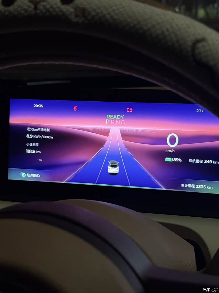 在广州,天气比较热,哪怕是冬天掉电也不厉害,目前由于是冬季提车,只能提供一个冬季续航参考。平均能耗大约在8.7-9.5 kWh/100km,对我来说特别满意了。还记得前两天去120km外的公园,我和我的男朋友一起开车去,我们在高速上特地测试了在100-120 km/h的速度区间,续航如何。我们当时高速实跑了65km,一开始续航显示还有232km,下了高速续航显示还有147km,那么折扣就是65/(232-1477)≈0.76,相当于是七六折左右,平时我从宿舍开到学校工位大约是8折多