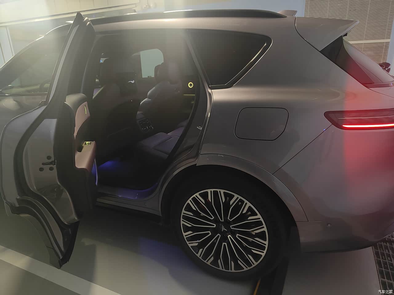 外观我选的琉璃紫,阳光下发出珠光的那种深紫,车长4915mm,线条拉开不显臃肿,解锁时前脸的动态星光格栅点亮,隐藏门把手把侧面收干净,20英寸轮毂把姿态撑住,尾部贯穿灯点亮后识别度好,深色漆面打理要勤快,换来的是路上看一眼就知道是哪台车。
