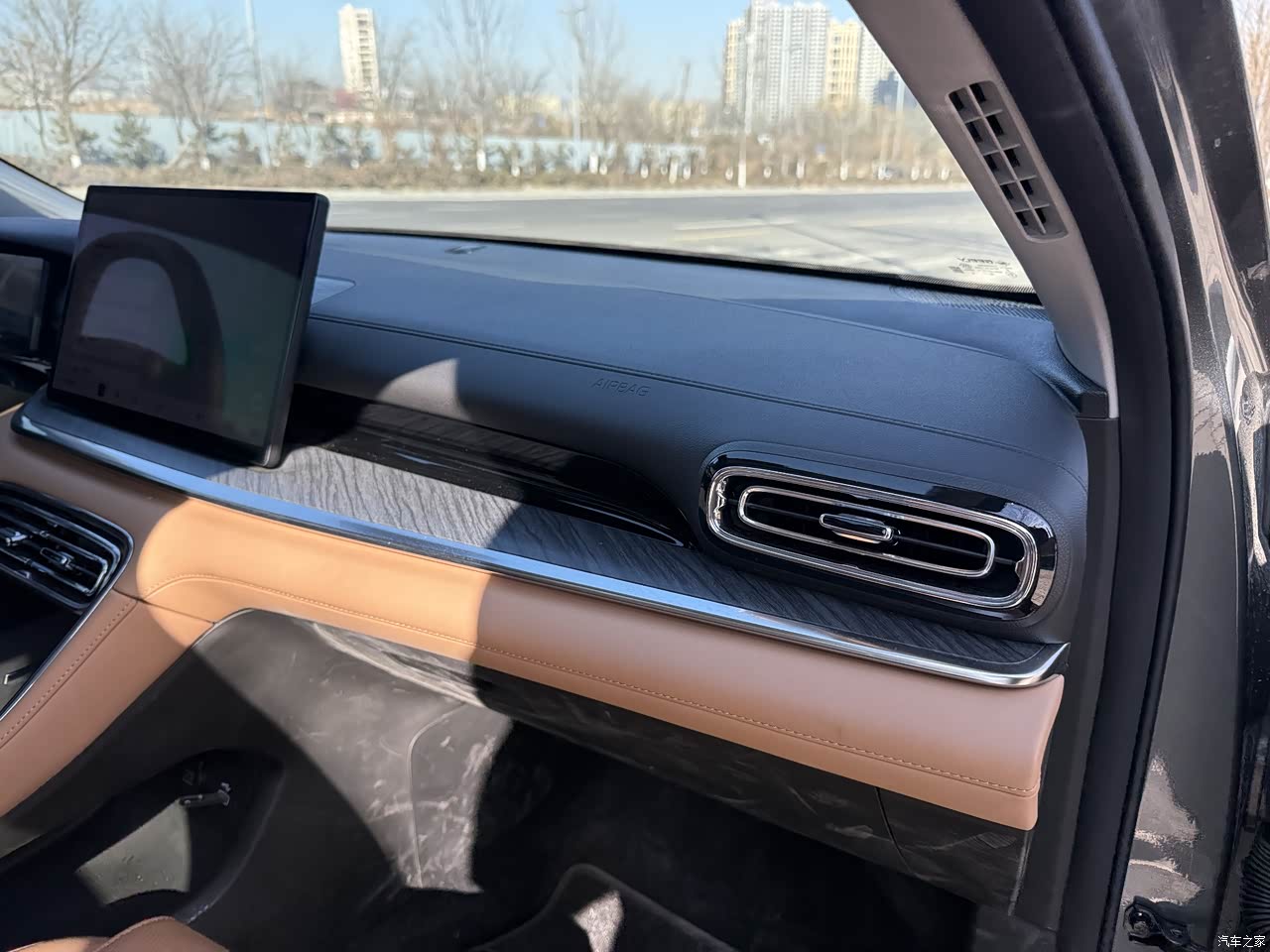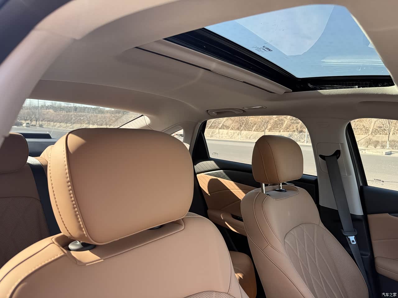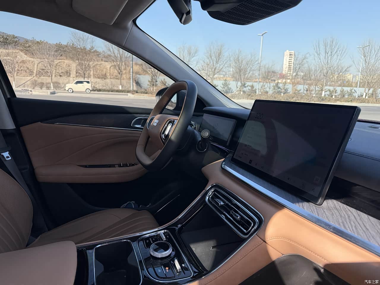 我选择的棕色内饰是明智之举。颜色较深,非常耐脏,对于有小孩的家庭来说非常实用。棕黑撞色的搭配也营造出了一种不错的轻奢感,坐进车内第一眼感觉不像这个价位的车。最吸引眼球的是那块大尺寸的悬浮式中控屏,科技氛围营造到位。