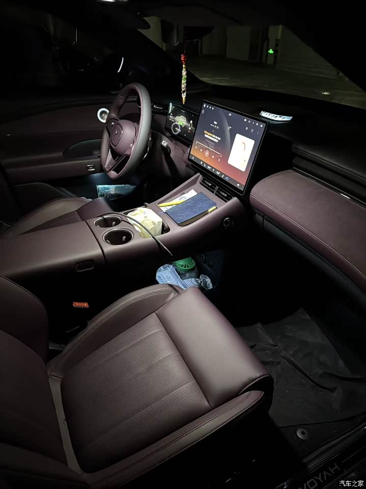 5、内饰部分 内饰的豪华感和科技感比老款提升太多了,整体风格简约又大气。车内大部分面积都是软质包裹,亲肤材质摸起来特别舒服,搭配门板上的木质点缀,质感直接拉满。科技感方面,中控大屏清晰度超高,搭配多色氛围灯,晚上开车时氛围特别好,氛围灯还有多种模式可以选,能根据心情切换。中控台采用环抱式布局,操作起来很便捷,整体做工也很精细,缝线均匀,接缝严密,摸起来处处都是高级感。