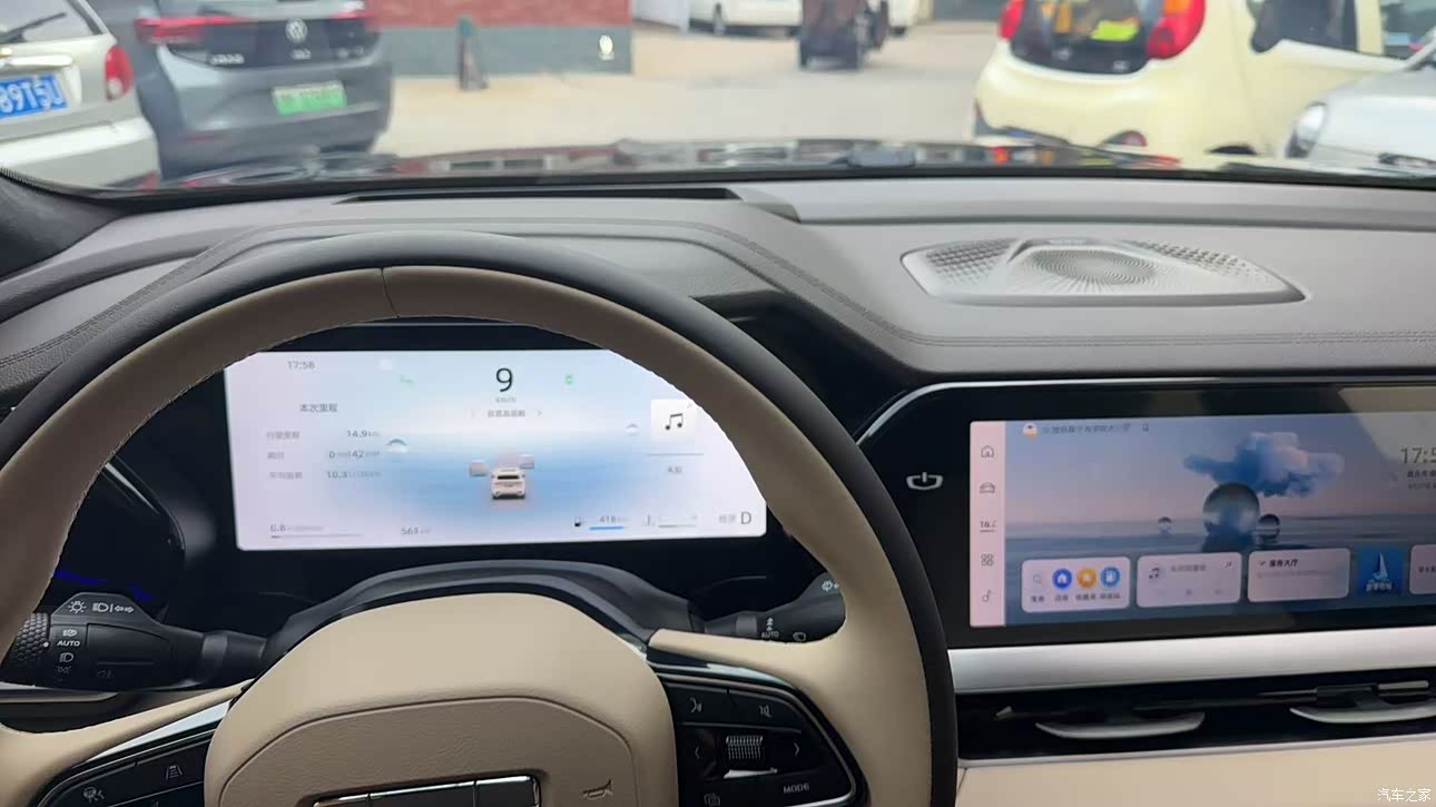 买的是杏色,刚开始考虑的是黑色,但黑色的是翻毛皮不太喜欢,杏色第一眼就喜欢上了,坐进去第一感觉就是干净,显得车里空间也挺大,看起来很柔和高级,也耐脏一些。 用料也挺实在,手能摸到的地方基本都是软的,配上那个浅色,整体质感就上来了。加上它本来就有的三块大屏,科技感这一块也不错,氛围灯也挺不错,说实话,女朋友也觉得选的好!!!