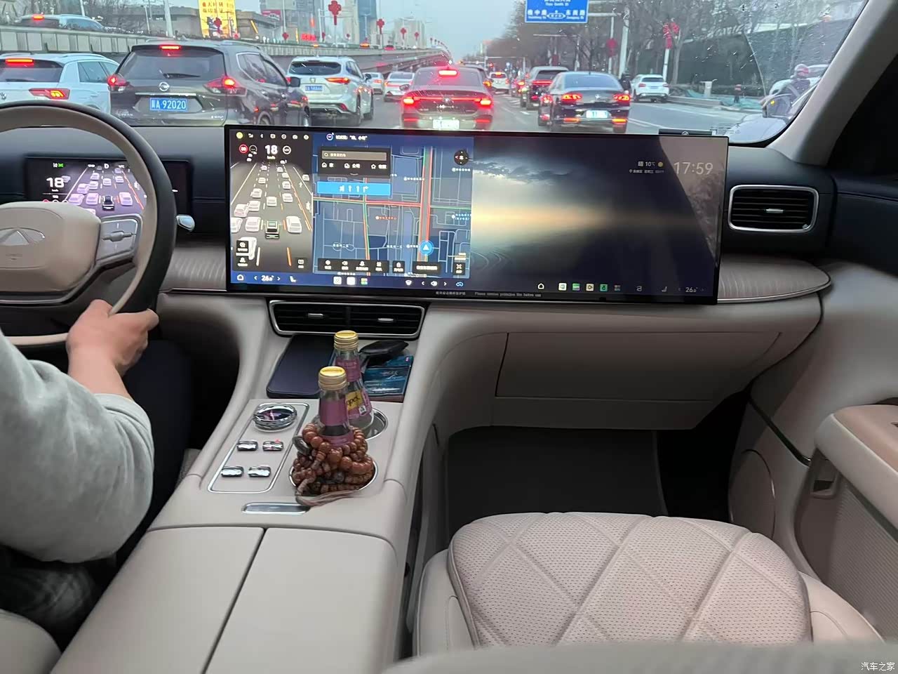 内饰用料还算扎实,摸得到的地方大多是软包,没有明显的硬塑料硌手的感觉,这点非常棒。新车异味很小,把保护膜撕掉后基本没啥味,有孩子的家庭会很在意这点。30寸大屏看起来就大气,导航看电影互相不干扰很棒,车机不卡顿,音响效果也很棒。