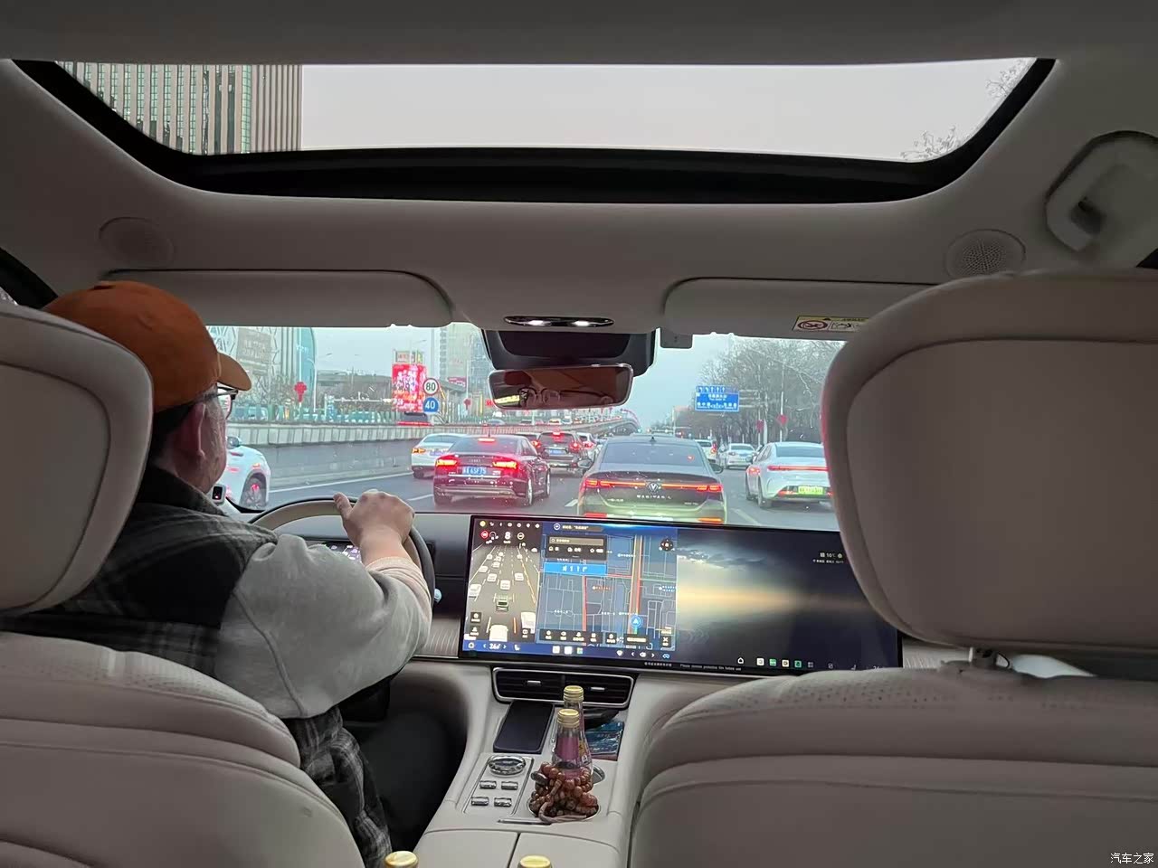 内饰用料还算扎实,摸得到的地方大多是软包,没有明显的硬塑料硌手的感觉,这点非常棒。新车异味很小,把保护膜撕掉后基本没啥味,有孩子的家庭会很在意这点。30寸大屏看起来就大气,导航看电影互相不干扰很棒,车机不卡顿,音响效果也很棒。