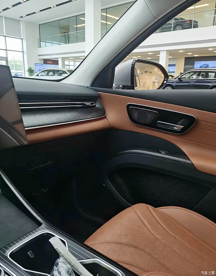 内饰采用琥珀棕配色,大部分采用软塑材质包裹,中控台与车门内板搭配木纹装饰条,质感上乘而且视觉效果上有很大提升。皮质座椅包裹性佳,配合氛围灯,营造出温馨科技的座舱氛围。整车细节处理的很到位,储物空间布局合理,双温区自动空调,第二排独立出风口等配置,进一步提升了驾乘舒适性,而且第二排的设计提升了乘客的舒适感。
