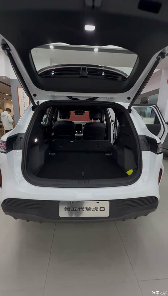 空间是瑞虎8的传统强项,豹款旗舰型更是越级表现。我朋友175cm身高,前排调好座椅,头部一拳多,不顶头,手脚伸展自如,长时间开车不累;座椅包裹性好,支撑到位,久坐不腰酸。 门板能放大水杯,中央扶手箱深大,无线充电板顺手,手机、钥匙、钱包都有专属位置。 后排更惊喜,腿部两拳多、头部一拳余量,翘二郎腿轻松;中间地台几乎纯平,坐三个人不挤,中间乘客不用歪身子。后排靠背可调、还有小桌板,带娃放零食、办公放平板都方便,长途更舒服。 后备箱常规容积够用,放20寸行李箱+婴儿车轻松;二排放倒后纯平,拉长件、出门露营睡觉都可以,喜欢露营的家庭,简直太香了。