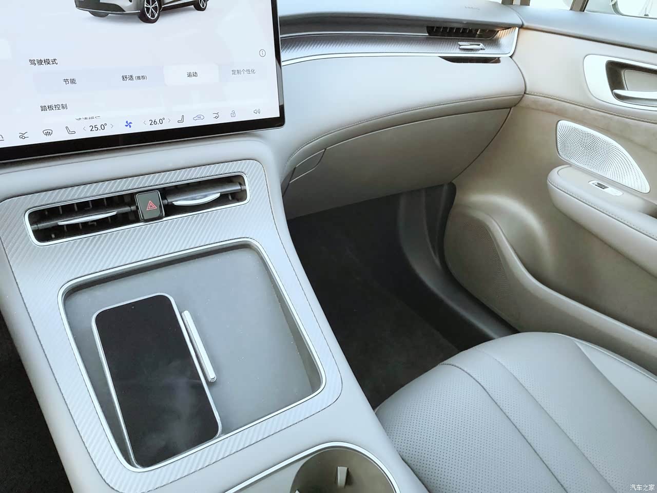 座椅软硬适中,不会软到陷进去,也不会硬得硌人。手能摸到的地方基本都是软的,方向盘握感扎实,中控屏操作起来很顺手,反应快,不卡顿。内饰设计不算花哨,但看着干净清爽,该有的功能都在明面上,不用翻半天找。