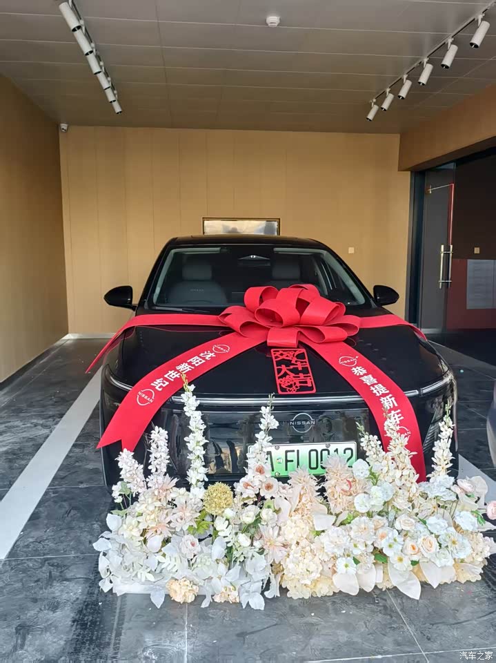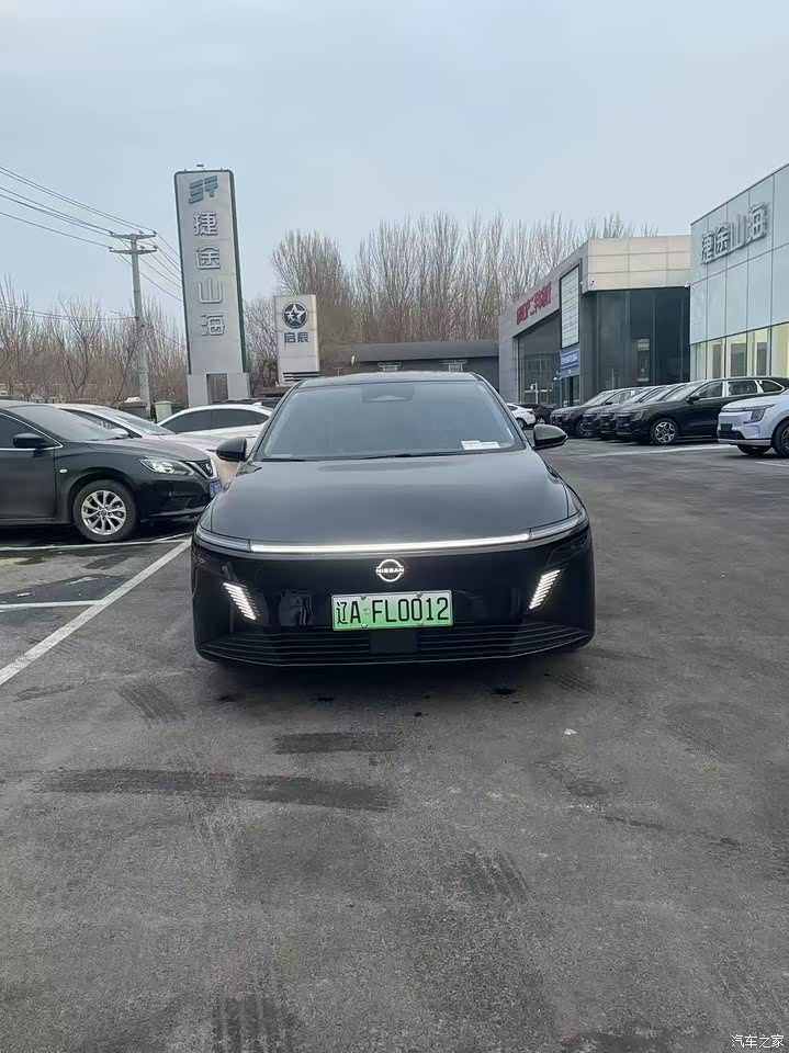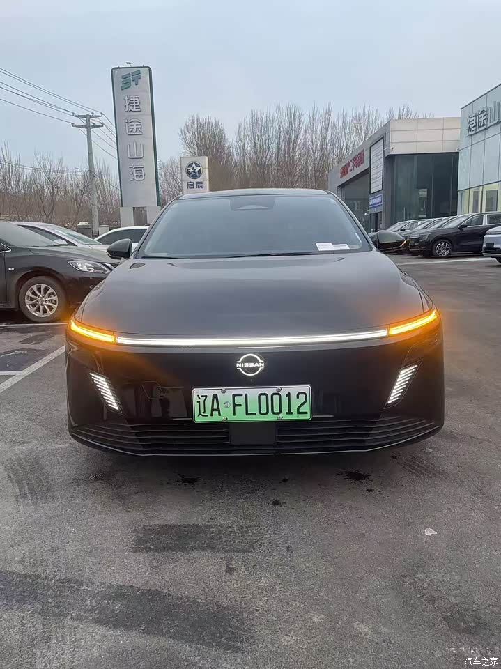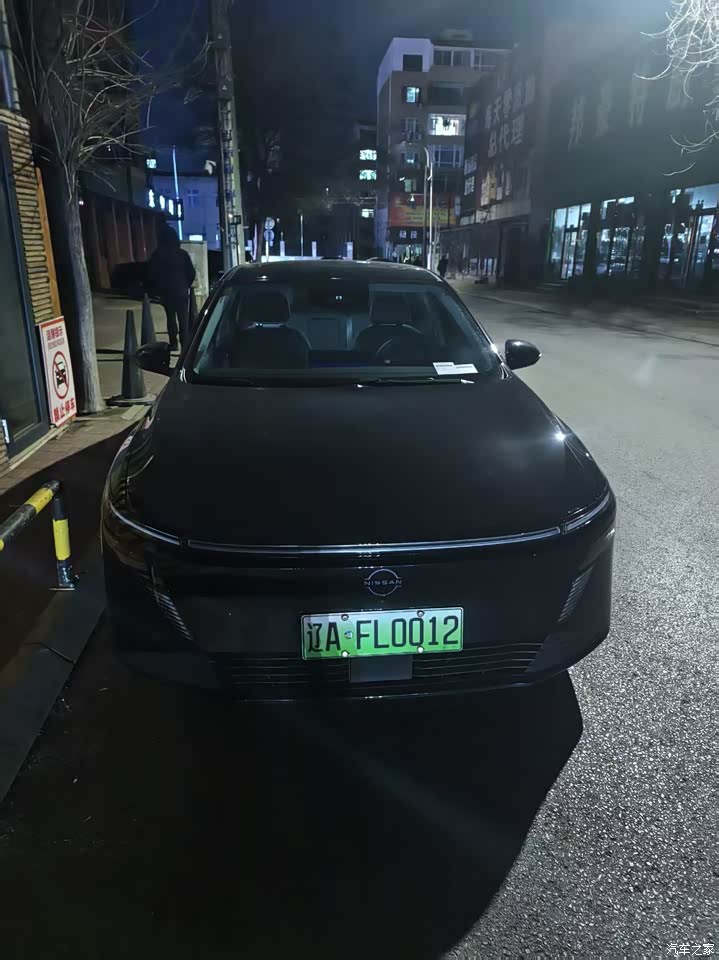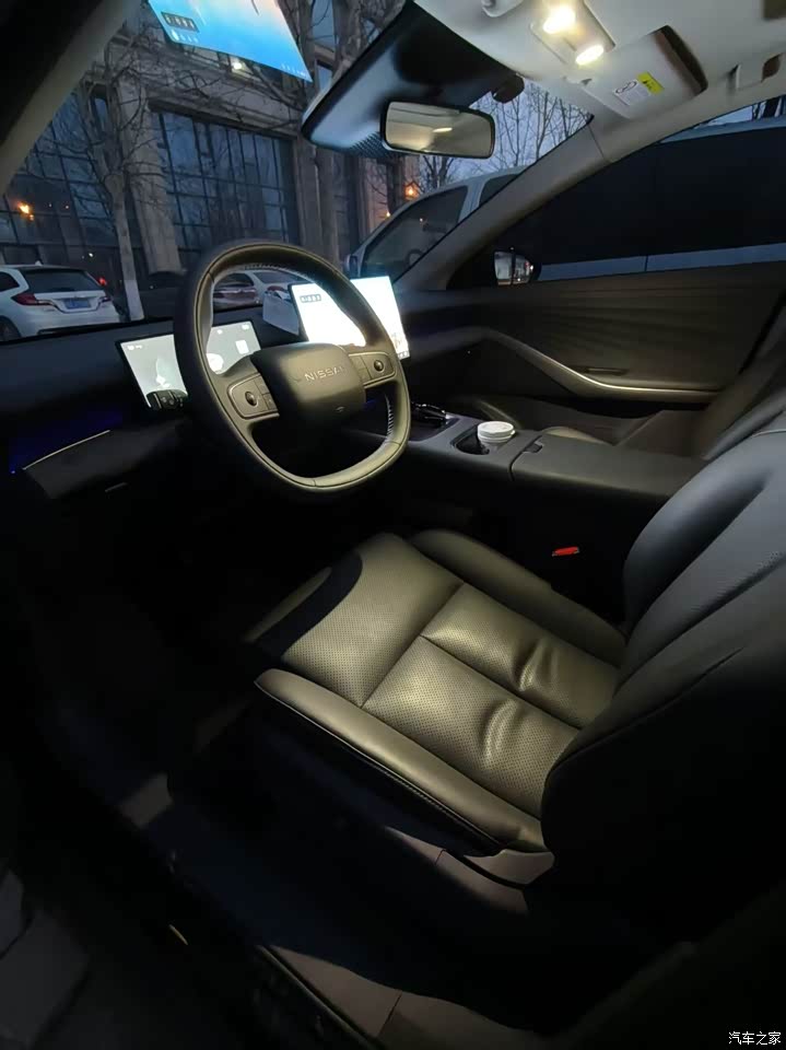 外观我选的曜石黑,风迹美学那套线条摆着,前脸贯穿灯带加发光NISSAN标,晚上解锁慢慢亮起来那一下挺有仪式感,车侧线条拉得长,四米八三的长度站那不臃,隐藏门把手现在都这样,黑色漆面不耐脏,刚洗完亮亮的跑一圈就薄薄一层灰,得勤快点打理,整体看着稳,有些小心思在细处,三十来岁的人开着合适,低调里带点活。
