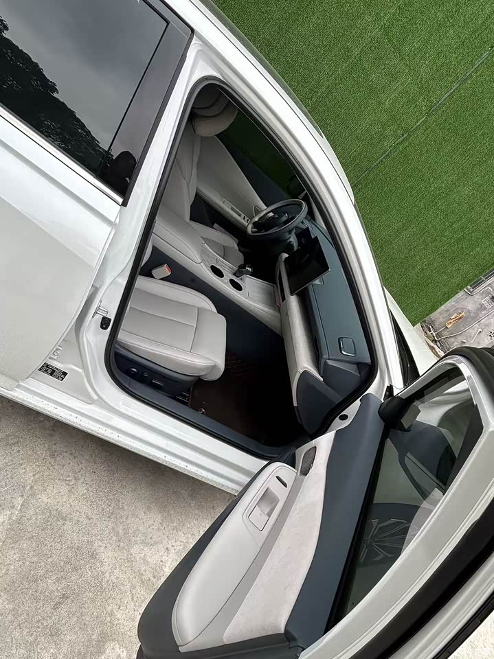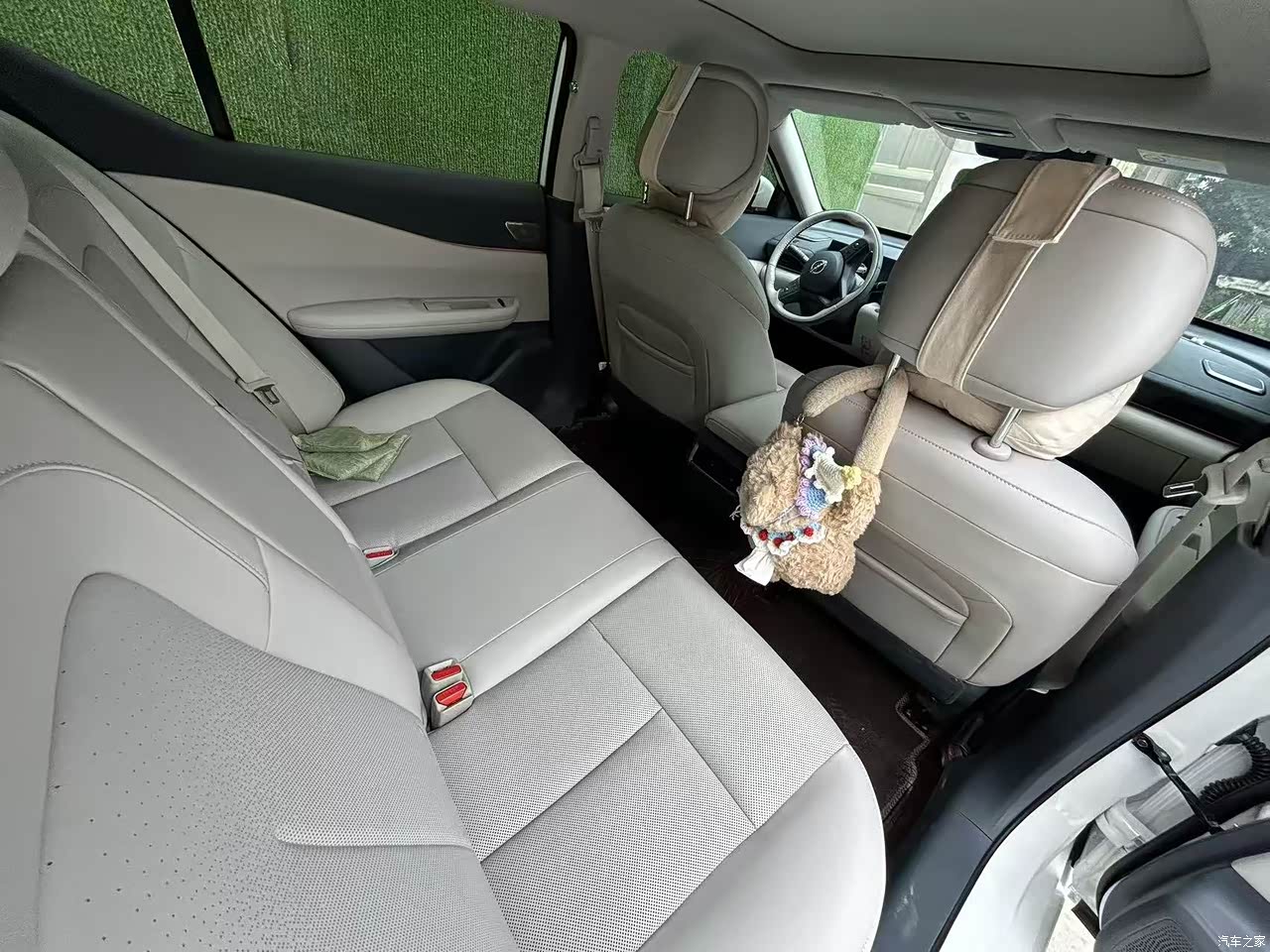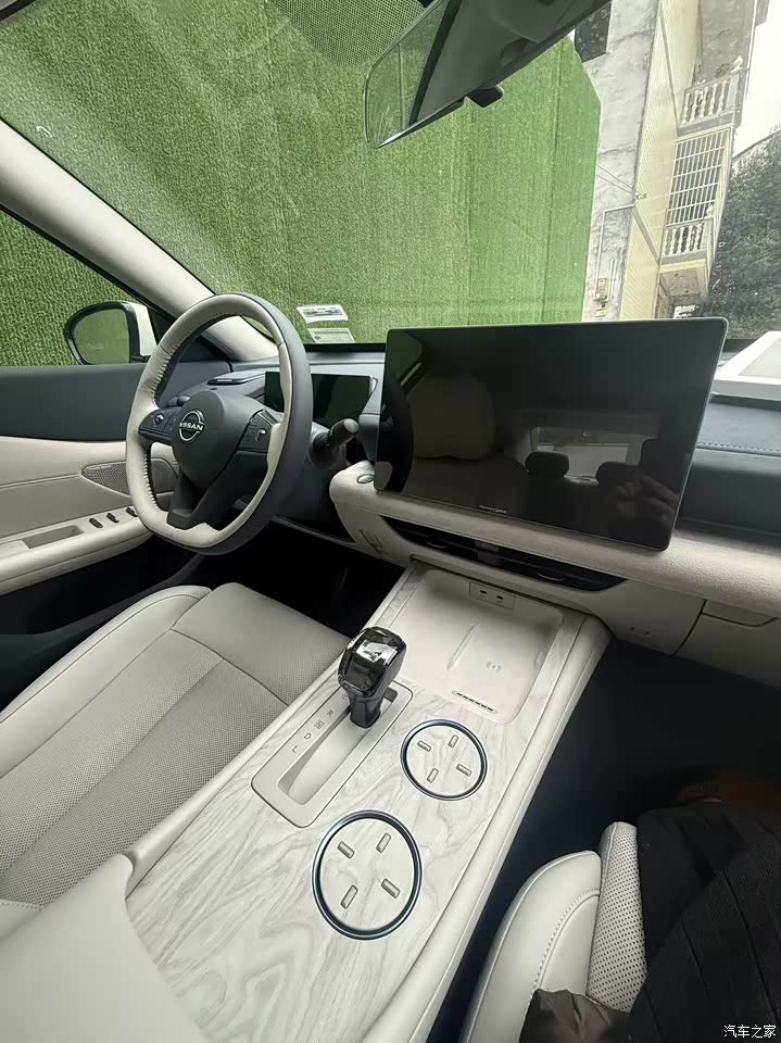 内饰选的晨曦岚白,进到车里一眼看去亮堂,和黑内饰比起来没有压住的感觉,座椅是真皮打孔,坐上去软,日产大沙发这个说法放在这车也对得上,白内饰需要勤快点,闺女脚在前排一踩立刻擦干净,牛仔裤掉色这事心里点着,终身免费保养里带内饰清洁,现在用着正常,到店里让他们处理一下更省力,中控台大面积软包,手往上一按不硬,整车的氛围比老款提升到位。