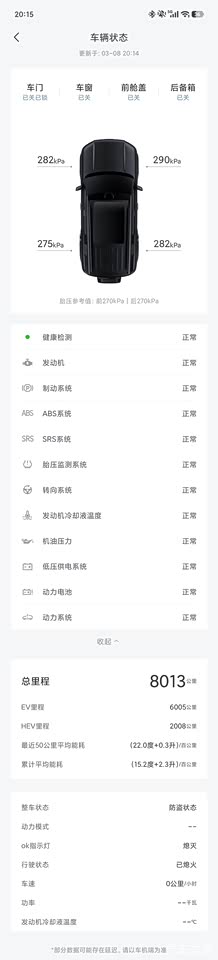 目前我的总行驶公里数是8013公里,其中EV纯电模式行驶了6005公里,HEV混动模式行驶了2008公里。目前的累计平均能耗是(15.2度 2.3升)/百公里。能耗表现目前我是非常满意的。
