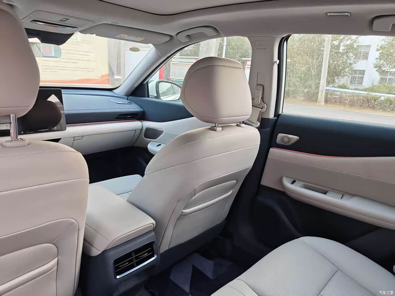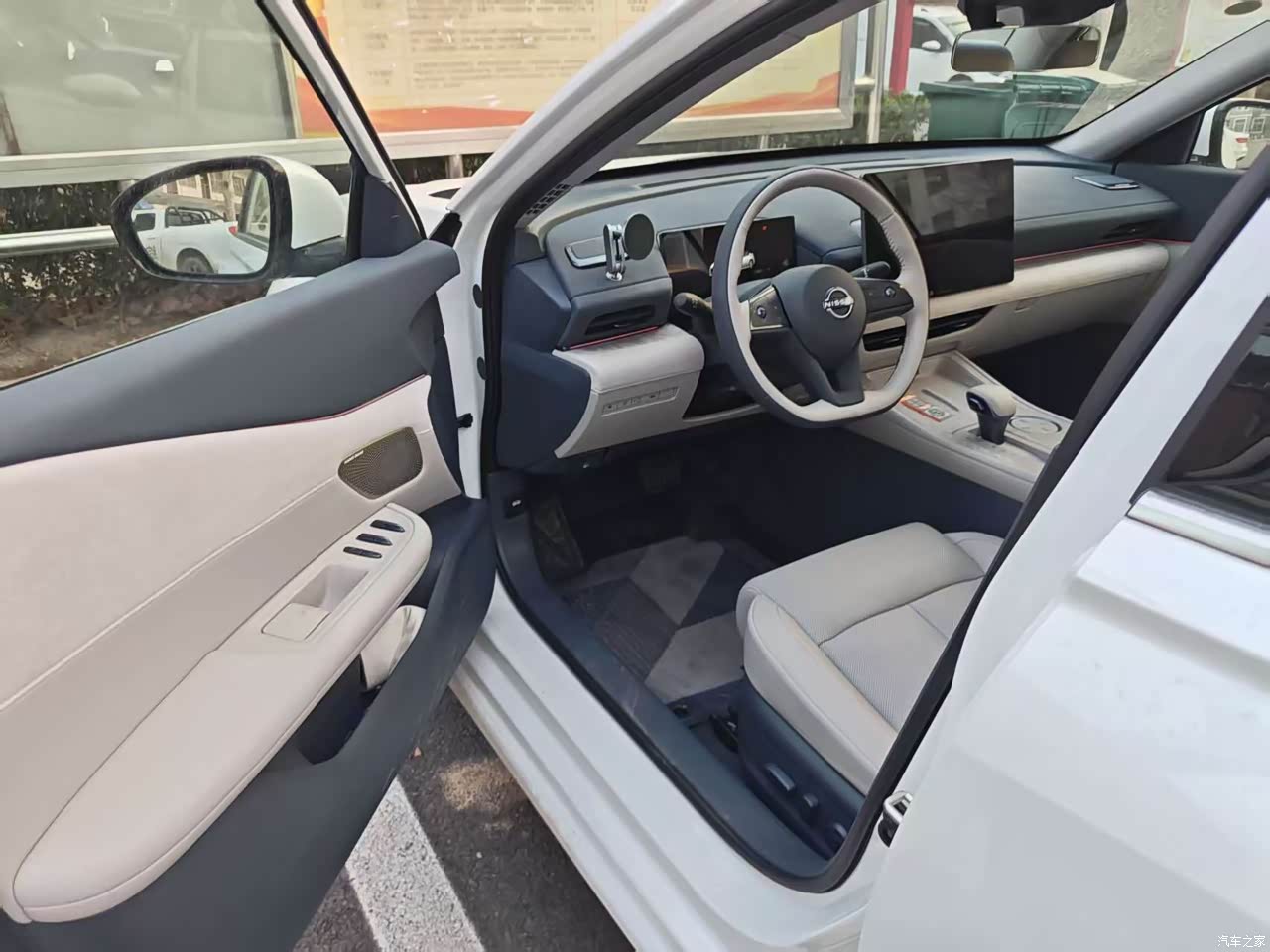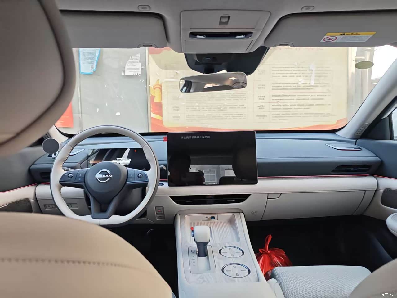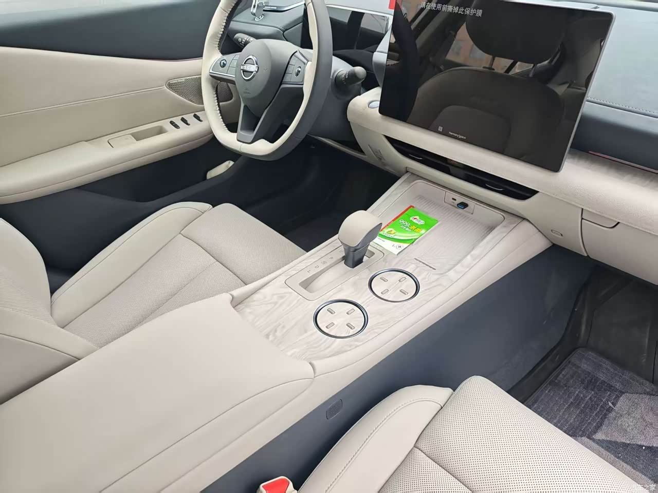内饰挑的白色,拍照好看,坐进去亮堂,清洁频率得跟上,提车那周闺女新鞋在后排门板蹭了一脚,黑印一条,媳妇拿清洁剂捣鼓了半天才淡,座椅用料是真皮,日产大沙发名声不虚,坐垫做到52厘米,腿部支撑稳,副驾有腿托和八点按摩,开远路按一会能缓一缓,仪表台上方软包,下方个别地方塑料感还是在,和国产同级比起来自信不算足,中控那块木纹板单独一块,旁边软包拼接,视觉上会断一刀,HUAWEI SOUND的中置喇叭点火慢慢升起来,这个小动作每天看一遍也不烦。。