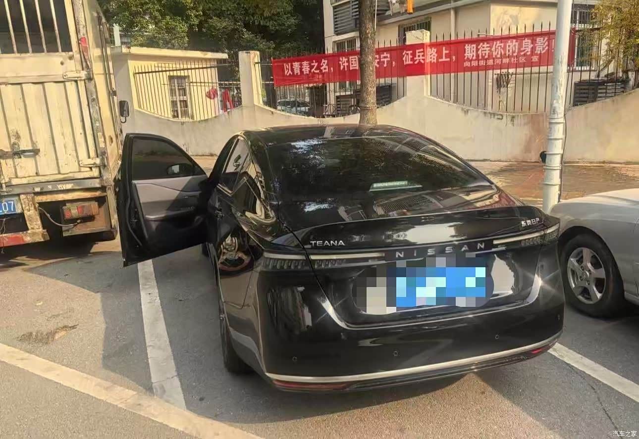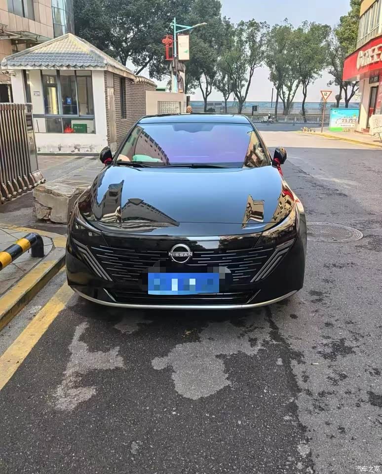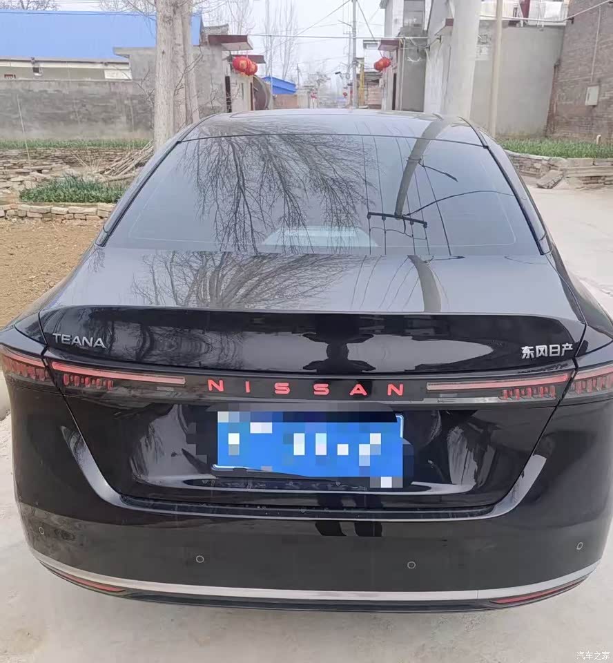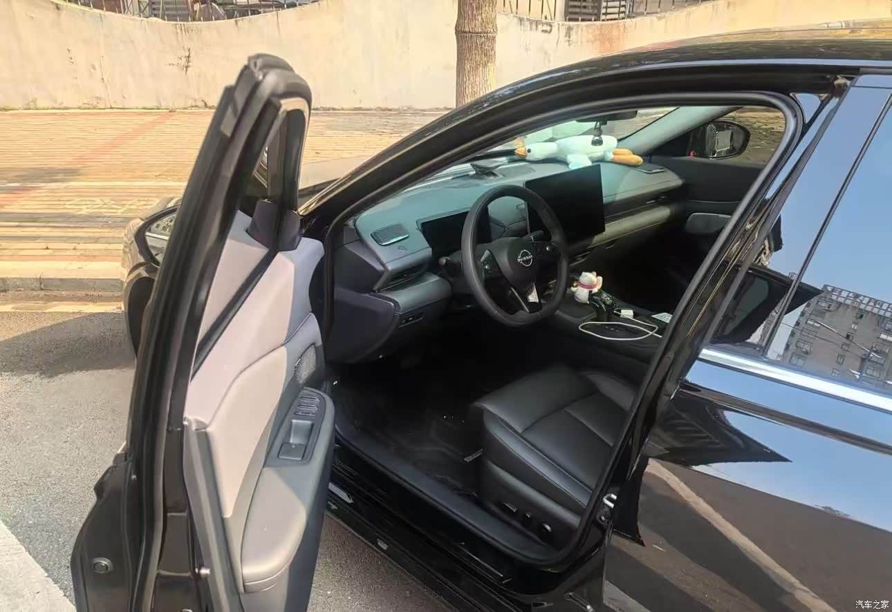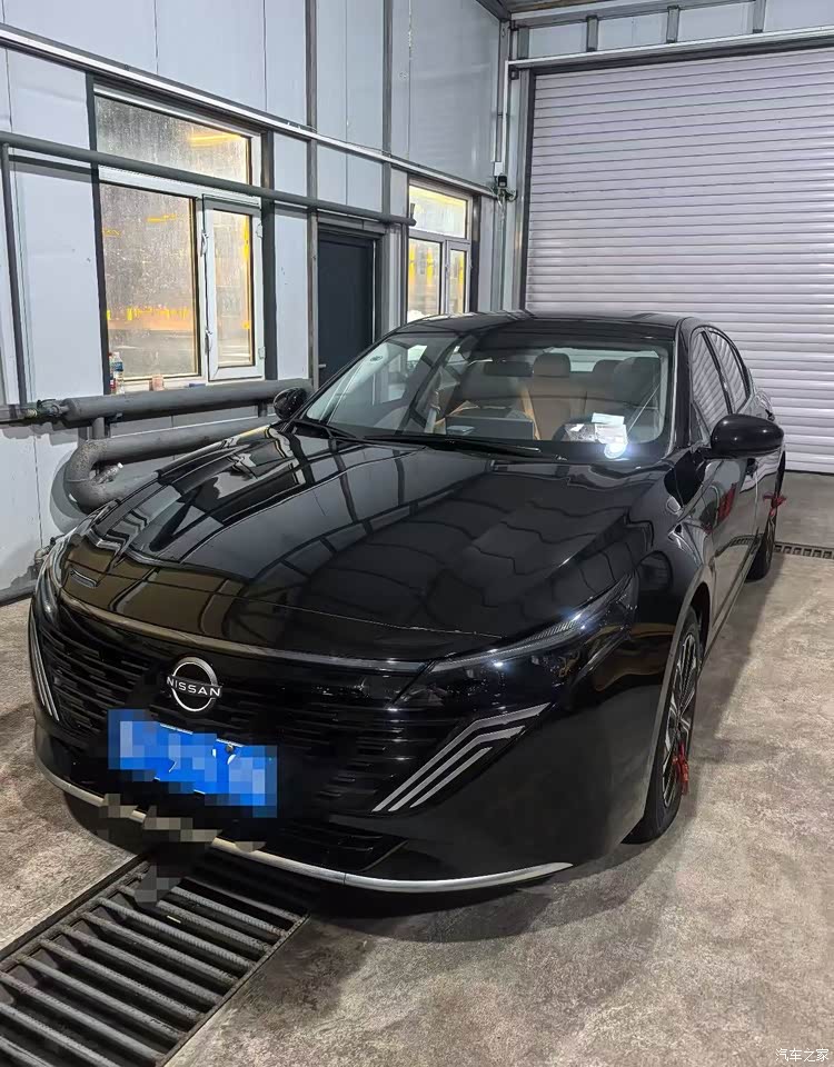 外观看着利落,我选的黑色,洗完车那一身亮漆在太阳底下像压了一层黑金,前脸新的V‑Motion格栅跟两侧灯组连起来,线条更扁更开阔,车尾做了贯穿灯,中间NISSAN字母能点亮,夜里一眼就认出来,车侧拉得顺直,比例耐看,黑色上灰快,在北京跑两天能见一层浮尘,维持清洁要勤快一点。