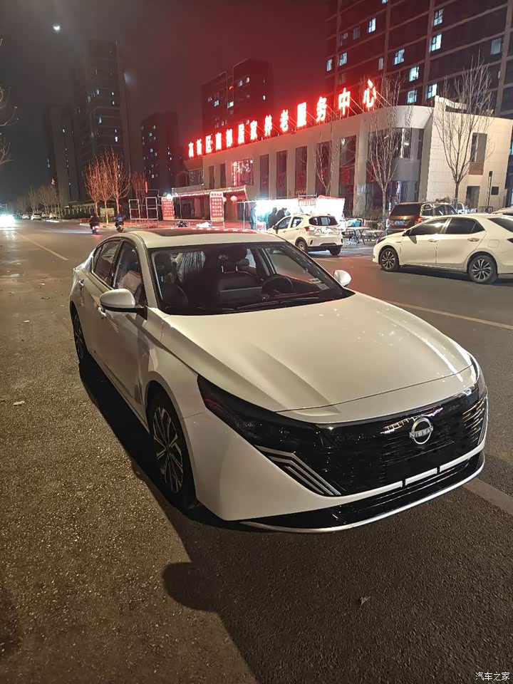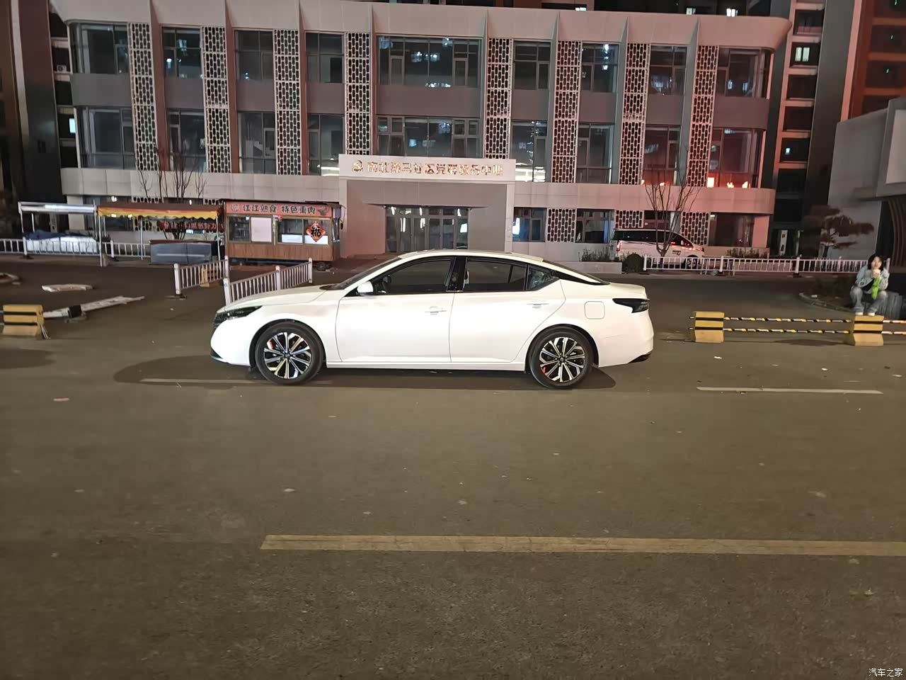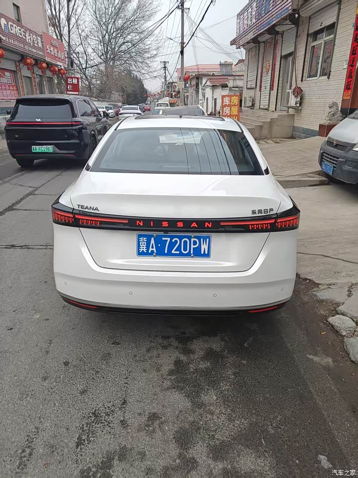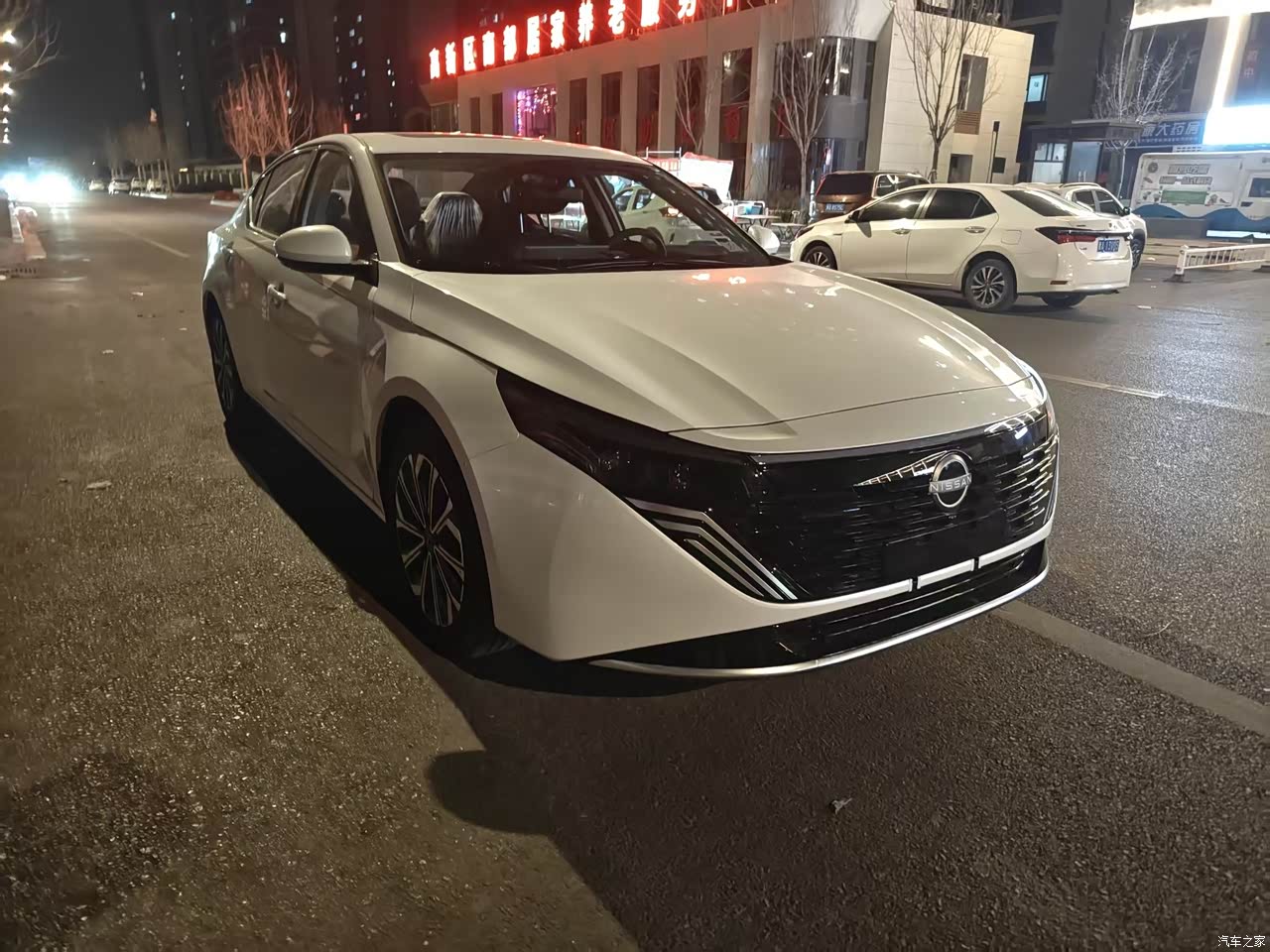 白色外观的存在感偏大,看着干净,夜里辨识性也高,这代前脸把大V中网做了黑化,镀铬少了,观感年轻些,前后灯带贯穿,晚上解锁车标和灯带一起亮,尾灯也是贯穿的,中间TEANA字母跟着亮,在地下车库找车不费眼,全车气质不冲,日常通勤停单位楼下不抢镜也不失体面。