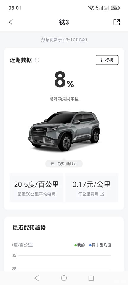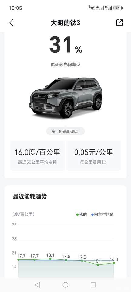 再说说不太满意的方面,电耗比其它一些电车高。因为是方盒子造型的SUV,风阻比较大,提车那天开70码左右,下雨可能对电耗也有负面影响,那时温度也不算高,回来后发现电耗有20多度一公里,知道电耗高没想到这么高,不过也可能是新车的缘故,那时温度确实很影响续航。最近气温上来了,我也熟悉了开这车的脚法,目前已经可以开到16度左右一公里的电耗了。