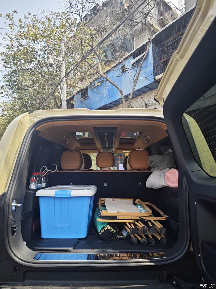 后备箱纵深可观,垂直高度也充裕,轻松容纳大件物品,没有局促感。 同时放了大号蓝色收纳箱、折叠露营桌椅套装,还预留了充足的剩余空间,日常家用、露营装备、搬家载物都能轻松hold住,实用性拉满